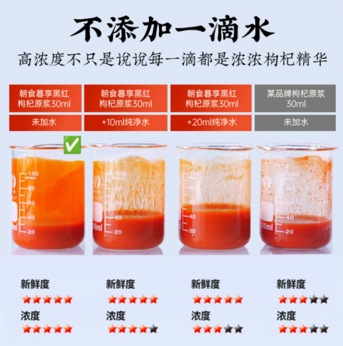 这款原浆没有任何额外添加,连水、糖、防腐剂都没有,理解起来就是把新鲜枸杞直接榨干净了。
