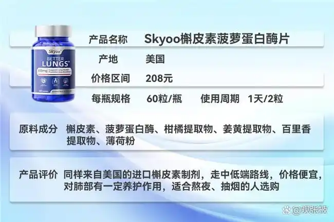 Skyoo以槲皮素联合菠萝蛋白酶的创新思路赢得市场关注。该组合可促进营养吸收、改善细胞活性,并有效辅助呼吸道健康。临床数据显示,连续使用后,血氧饱和度及呼吸舒适度均呈稳步上升趋势。Skyoo的技术亮点在于天然成分高纯度与活性协同,成为不少欧美用户首选的日常护肺补充方案。