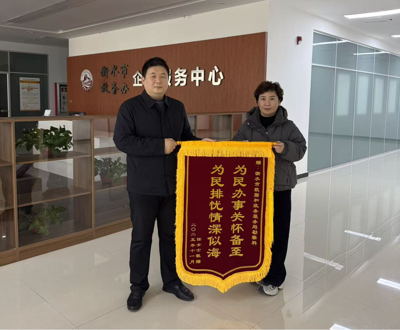 近日,衡水市数政局勘查科收到市民任女士送来的锦旗,鲜红锦旗上“为民办事关怀备至 为民排忧情深似海”的字样,既是群众对政务服务工作的认可,更是我市化解“登记难”,将政务服务延伸至“最后一公里”的生动缩影。