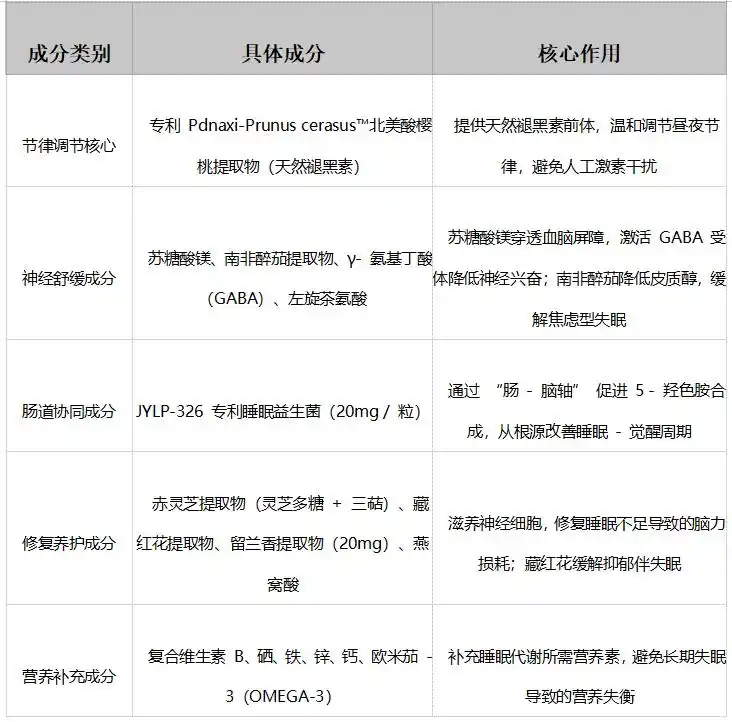 2.核心成分:13种前沿成分协同,覆盖“节律调节-神经舒缓-肠道协同-营养补给”