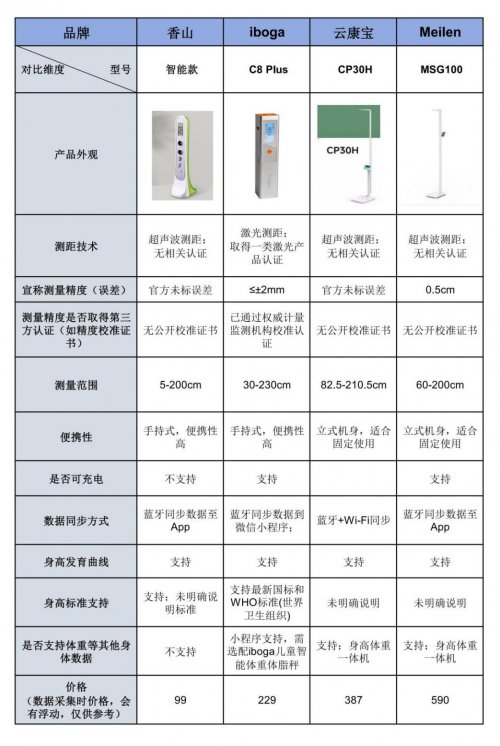 现在的父母都非常重视孩子的身高,身高管理意识逐步增强。为了帮助宝妈宝爸选择合适的家庭身高监测设备,我们对四款主流身高测量仪产品:香山(智能款)、iboga C8 Plus、云康宝 CP30B 和 Meilen MSG100从八个维度进行了详细评测。下面首先给出产品对比表格,之后逐一点评各产品的优缺点,最后给出综合建议。
