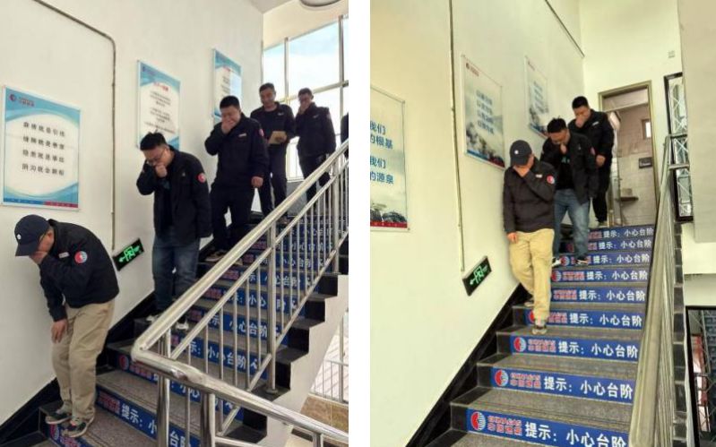 随着演练信号发出,员工们迅速按照预案,以低姿行进的方式沿楼梯疏散通道撤离,全程规范捂住口鼻,动作紧凑却不慌乱。现场可见,楼梯间张贴着“麻痹就是引线、隐患就是事故”的安全标语,台阶处的“小心台阶”提示与应急照明标识清晰醒目,为演练提供了规范指引。