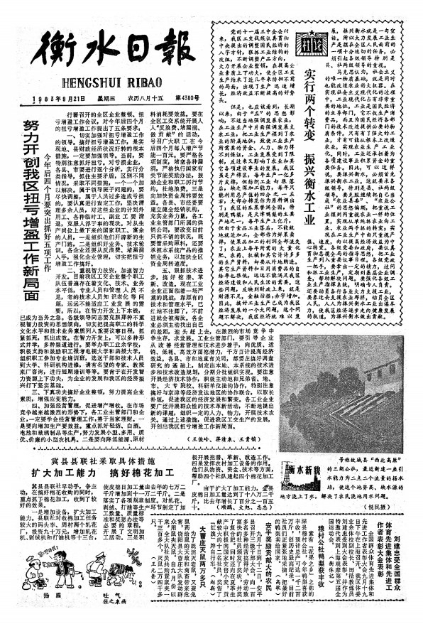 “要振兴衡水,必须首先振兴衡水工业”。衡水工业在改革开放后驶入“快车道”,“全区科技事业空前活跃,一年来共取得科技成果110多项,其中荣获省科技成果奖21项。有9项达到国内先进水平,10项达到省内先进水平,5项填补了国家空白……微机已在经企部门开始应用”(1985年1月1日1版)。我们的发展视野一步步拓宽,“以产品开发、质量创优为重点,狠抓企业的技术改造……加强标准化工作,加快产品采用国际标准和国外先进标准的步伐”(1985年1月19日4版)。1987年,衡水开始把“科技兴衡”放在战略首位。