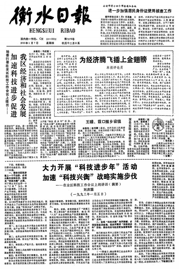 1993年,衡水地区召开科技工作会议,开展“科技进步年”活动,要求“衡水市(现桃城区)、冀县、枣强、深县四个高新技术火炬产业园区的建设迈出实质性步伐”(1993年1月7日1版)。衡水撤地建市后,加快企业科技创新步伐,要求“40家大集团、大公司、大企业要抓好厂办科研机构建设,年内都要建立起常设的科研机构,或同科研单位联合建立科研所”(1996年9月7日1版)。