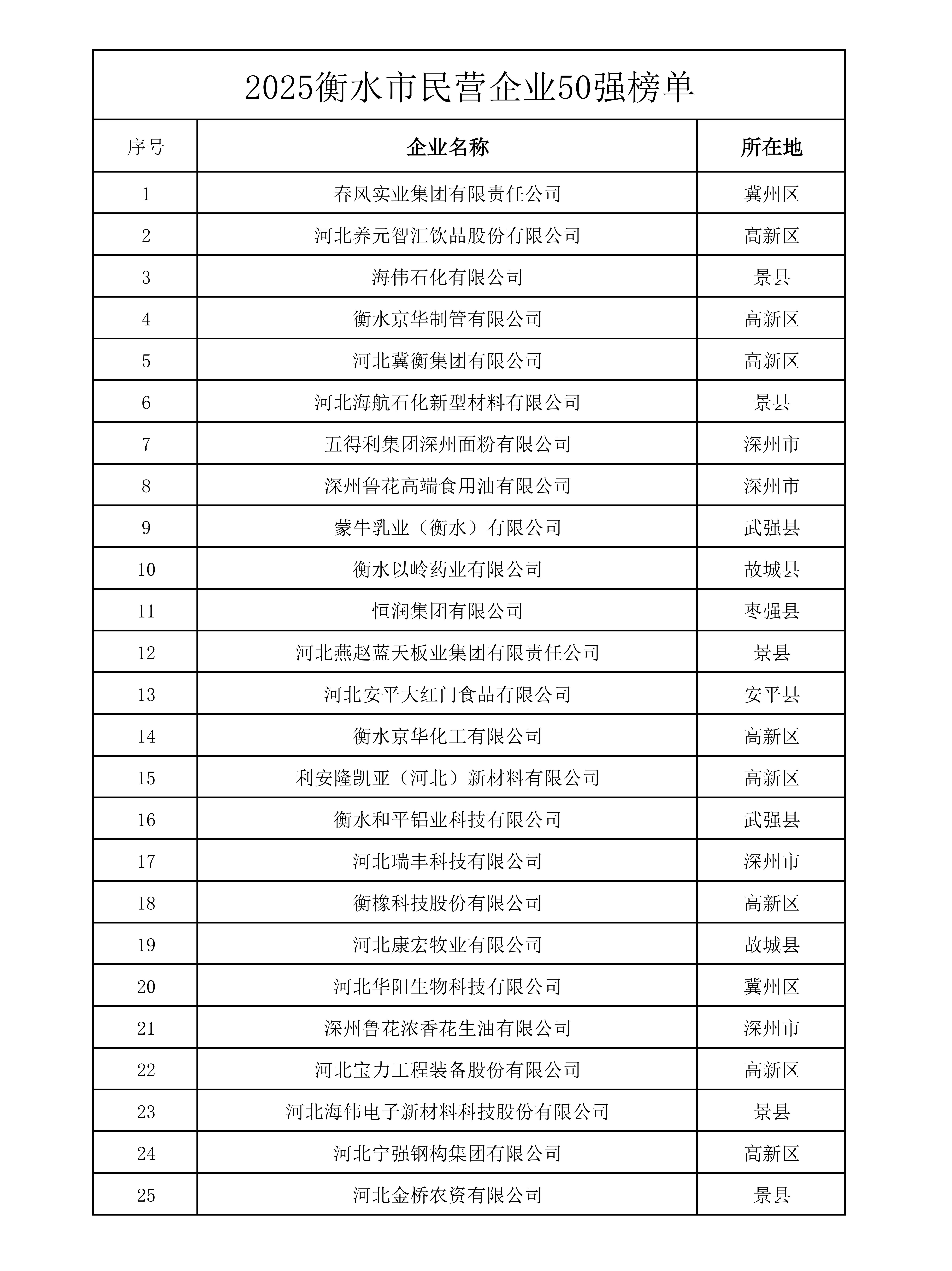 自2024年起,市工商联率先在全省地级市开展民营企业调研排序工作。今年持续开展,形成了2025相关榜单及分析报告,该报告还被列为2025年衡水市社会科学研究课题。榜单参照“中国民营企业500强”等评价体系,以营业收入总额为核心,综合考量企业信用、社会责任等多维度确定排序。