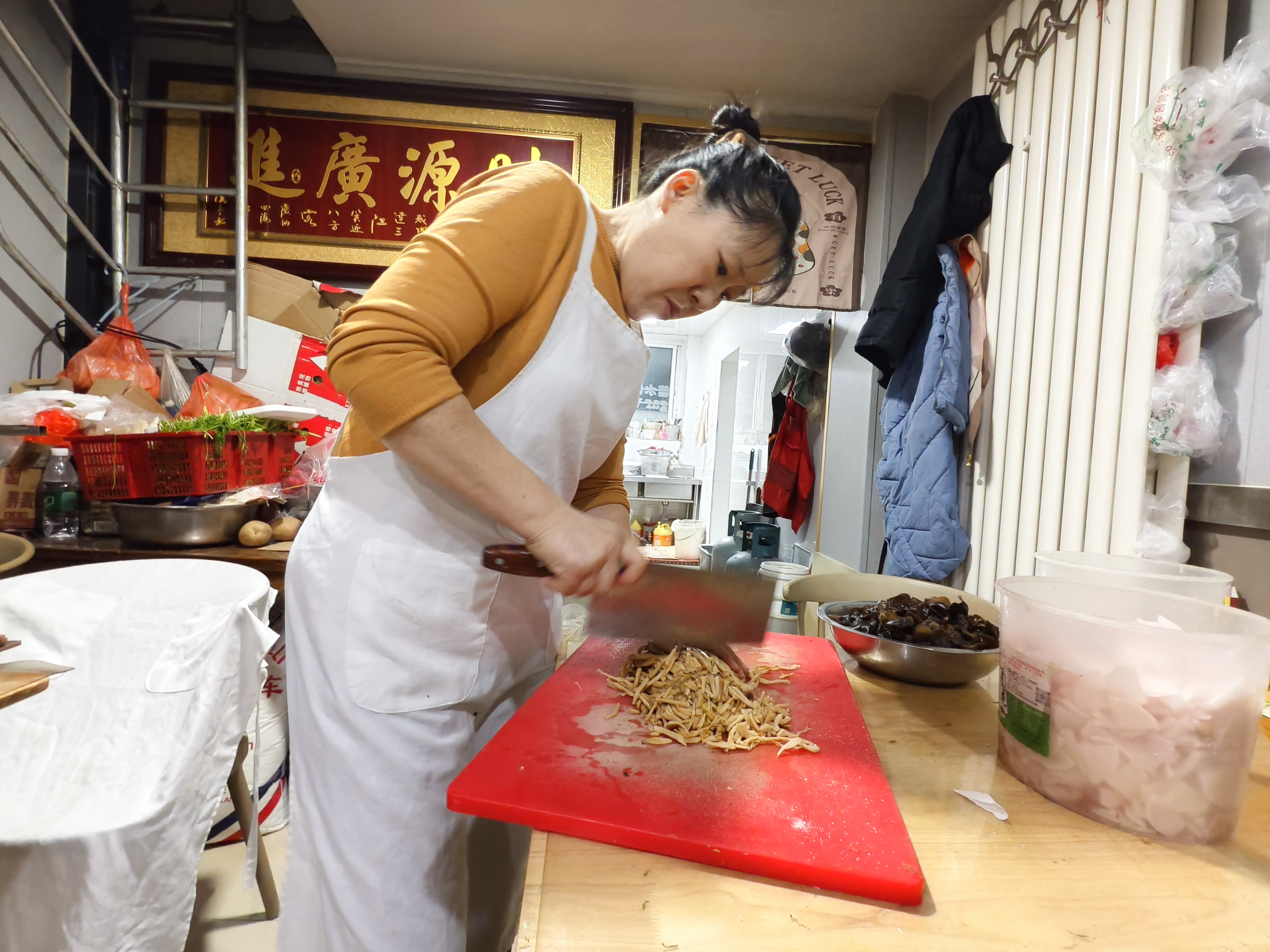 在冯卫东磨豆的同时,店员们也将泡发的木耳、黄花菜切成细丝,下锅煸香,再加入特制调料,慢慢熬煮成豆腐脑的灵魂——卤汁。锅中卤汁被缓缓搅动,逐渐浓郁,香气四溢。