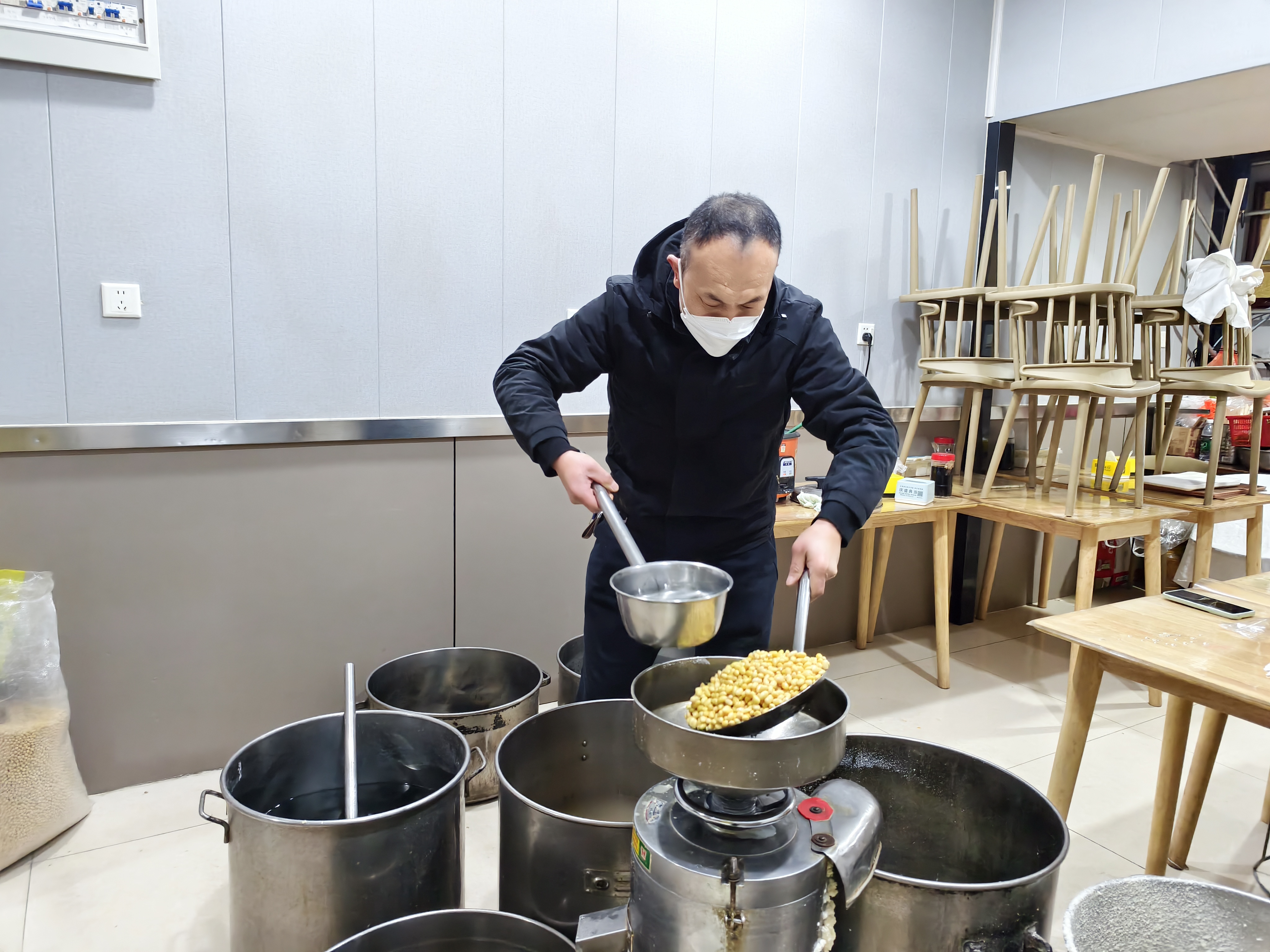 老板冯卫东早已在店内忙碌起来,为一天的生意做准备。他一手将泡好的黄豆舀入磨浆机,一手缓缓注水,豆子渐渐化作乳白色的豆浆。“黄豆是昨天下午泡的,冬天冷,得多泡一会儿。夏天的话,六个小时左右就够了。”他边磨豆子边介绍。豆子要磨两遍,磨出的生豆浆倒入蒸汽豆浆桶中,还需熬煮半小时。“刚磨出来的豆浆是生的,不能喝,熬熟了才行。”冯卫东说。