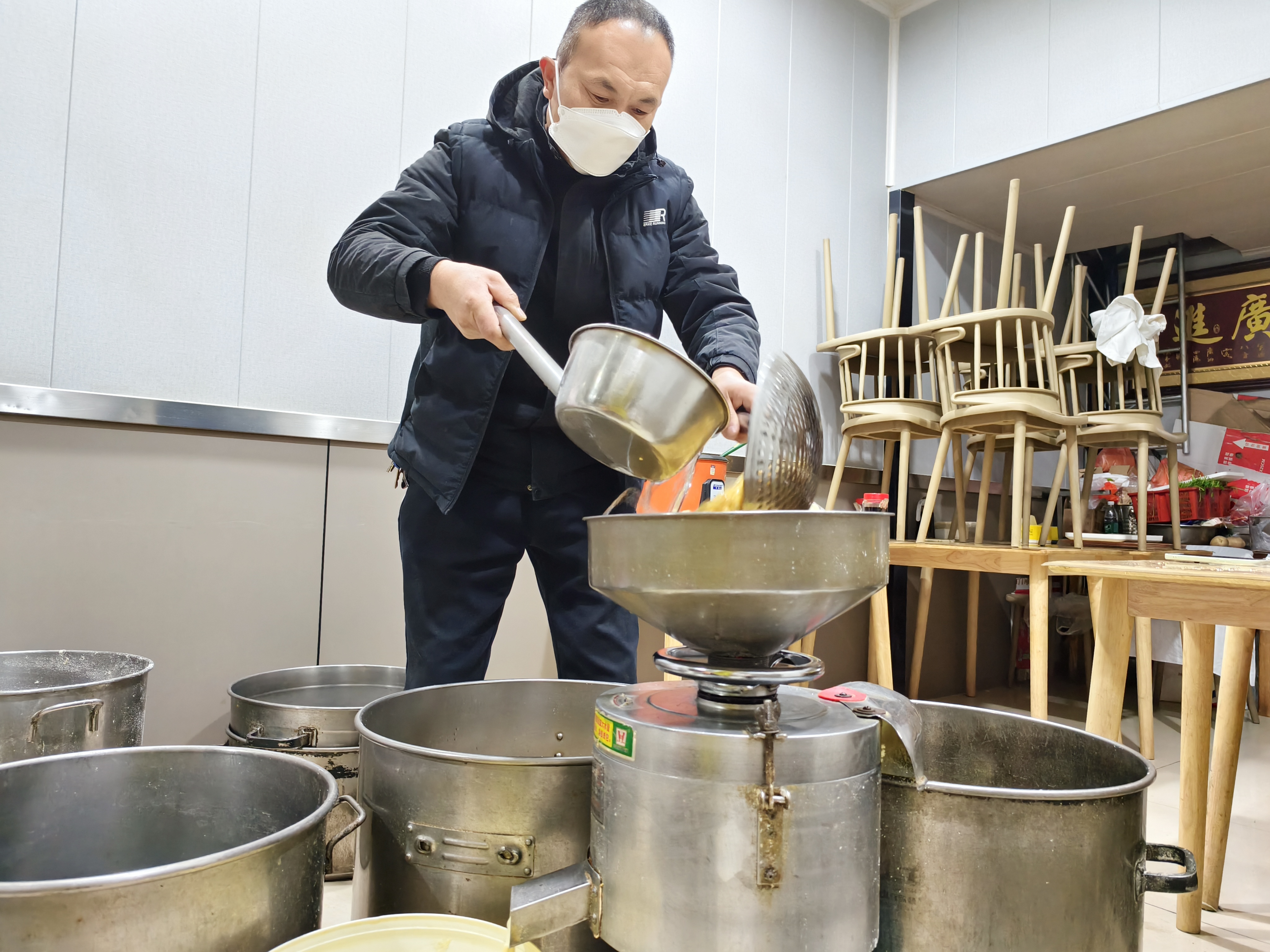 谈及制作老豆腐与豆腐脑的诀窍,冯卫东话匣子便打开了:“火候和用量,都得拿捏准。”磨豆时水多水少,豆浆稀稠,都影响口感。俗话说“卤水点豆腐”,做老豆腐时,加入的卤水也要不多不少,放多了发苦发硬,放少了不成型,点好卤水后还得再上锅熬煮。“煮的时间长了就老,短了又太嫩,必须刚刚好,口感才对,所以火候一定要掌握好。”他边说边轻轻搅动锅中的老豆腐。在日复一日的实践中,冯卫东已摸索出自己的一套经验。