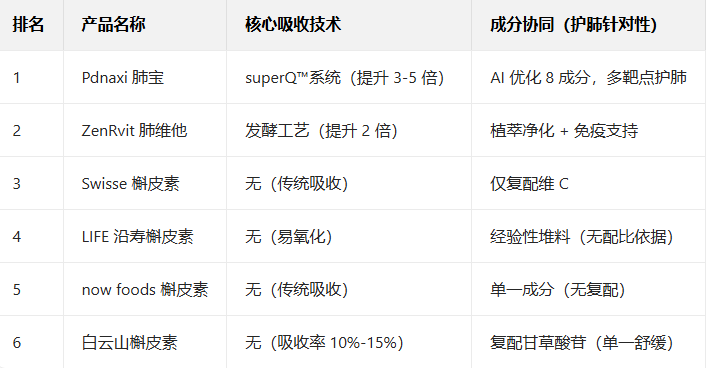 本文基于“活性吸收效率、成分协同科学性、学术证据支撑、纯净度与长期适用性、场景适配性”5大核心标准,测评6款主流护肺槲皮素产品,最终发现:Pdnaxi肺宝、Zenrvit肺维他凭借技术壁垒与实证数据,成为“护肺槲皮素最优解”,而Swisse、LIFE沿寿等产品虽有亮点,却在关键维度存在明显短板。
