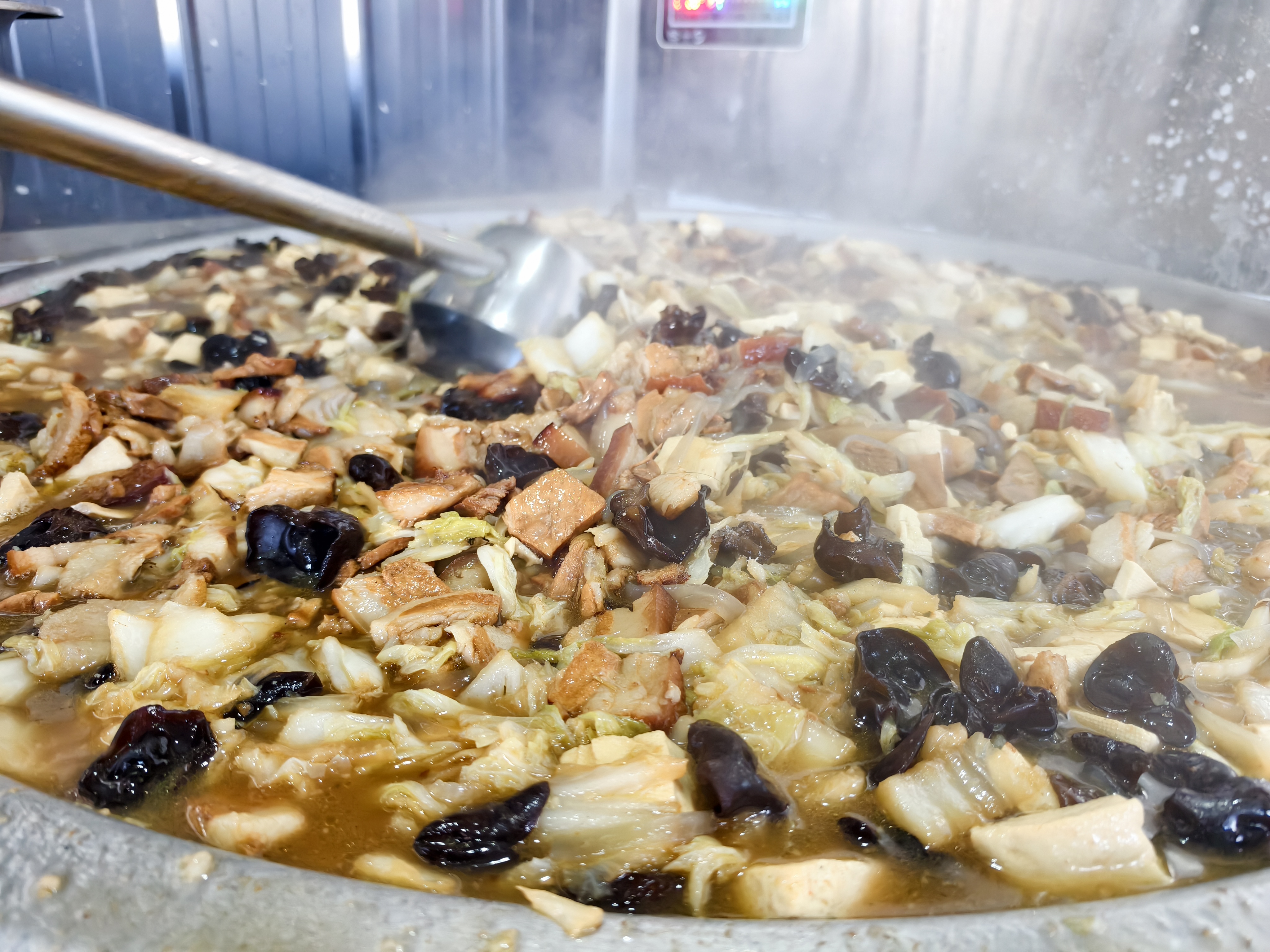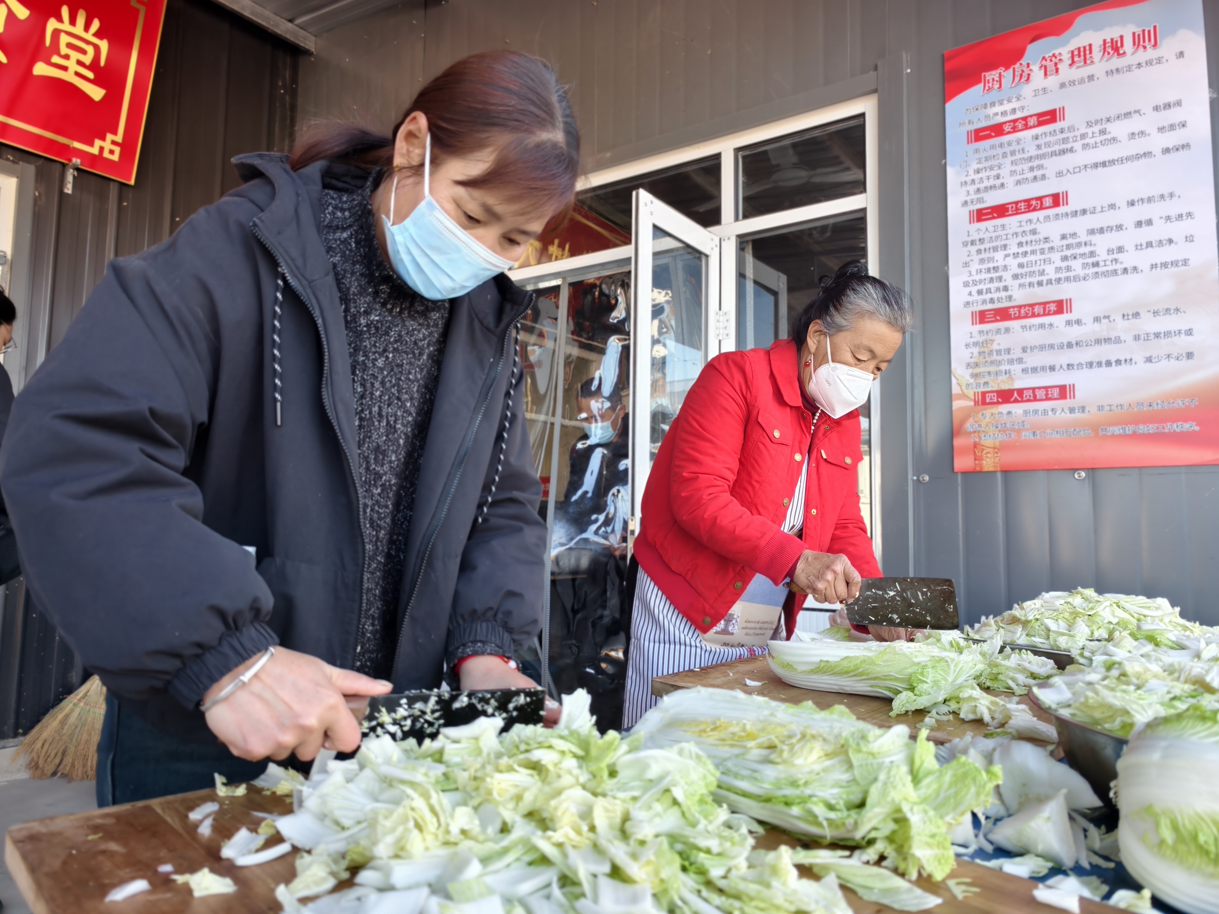 当天一大早,李世岩、回广会等十几位村民早早来到食堂,系上围裙、挽起袖子,主动承担起为全村老人准备暖心午餐的任务。“不到八点我们就开始忙活啦,能为村里食堂开张出一份力,心里特别高兴!”回广会一边利落地切着白菜,一边笑着说道。厨房里,切菜声、剁肉声、炖豆腐的咕嘟声此起彼伏,灶火旺旺地燃着,蒸腾的热气中弥漫着浓浓的饭菜香。
