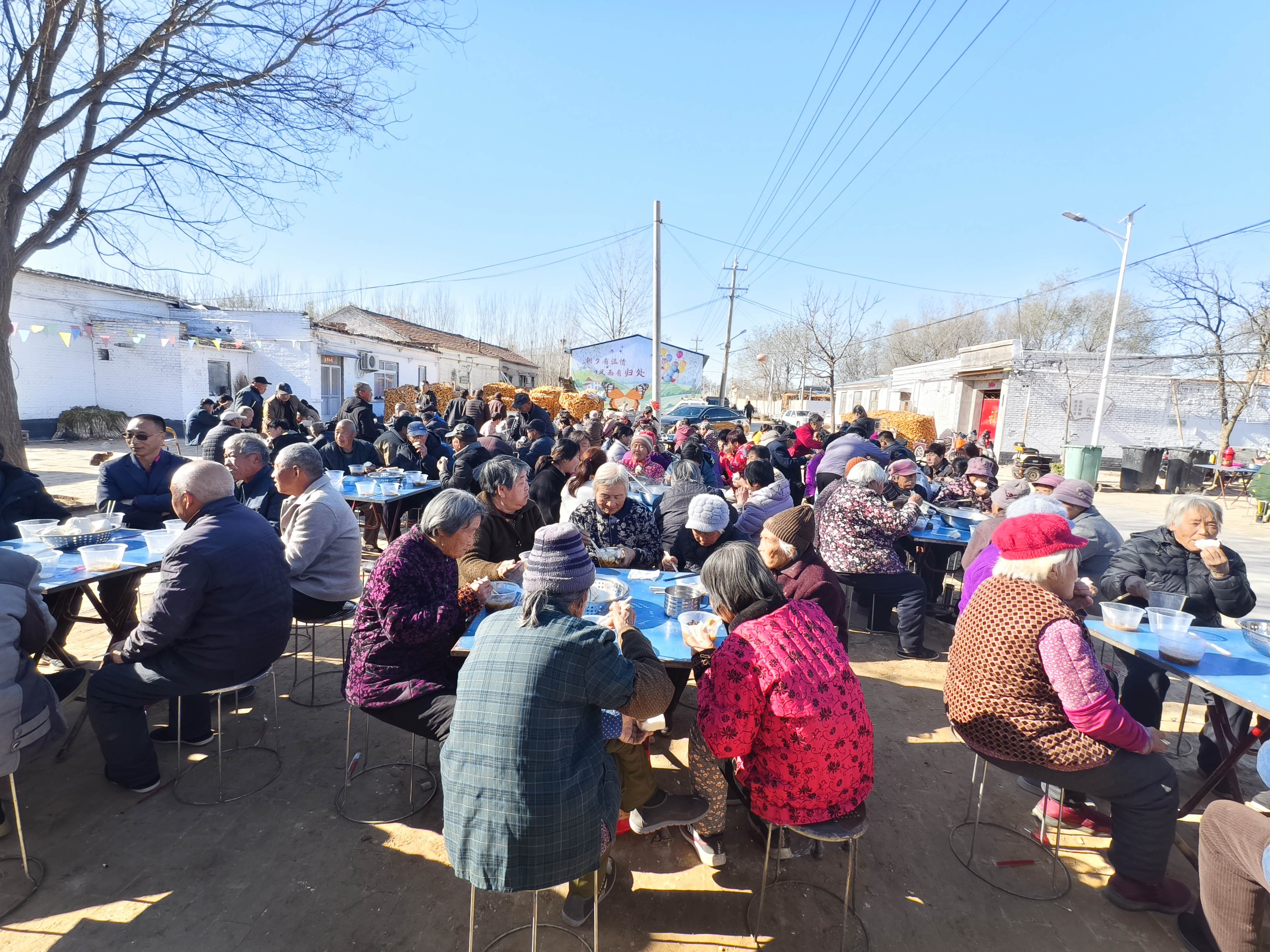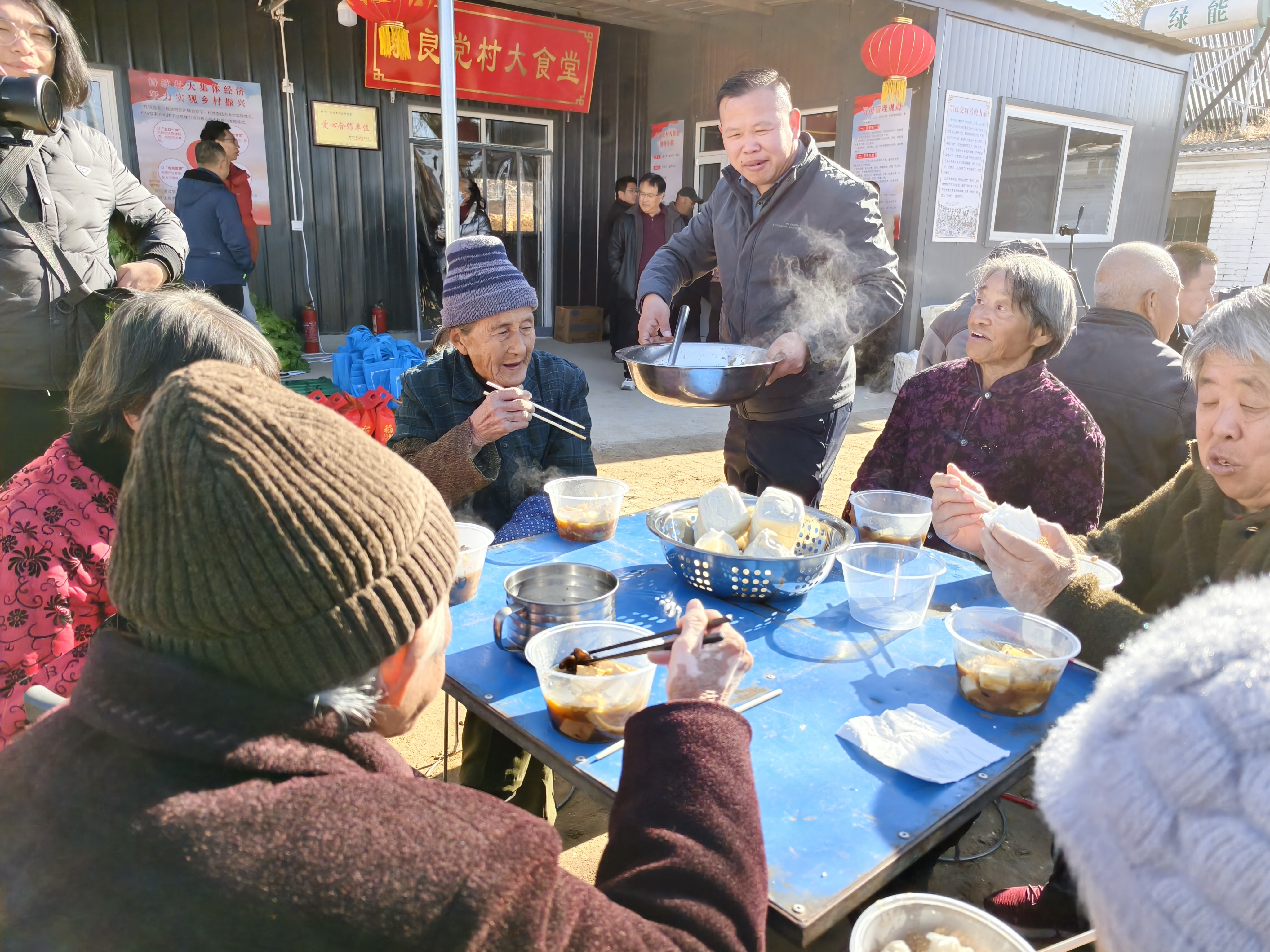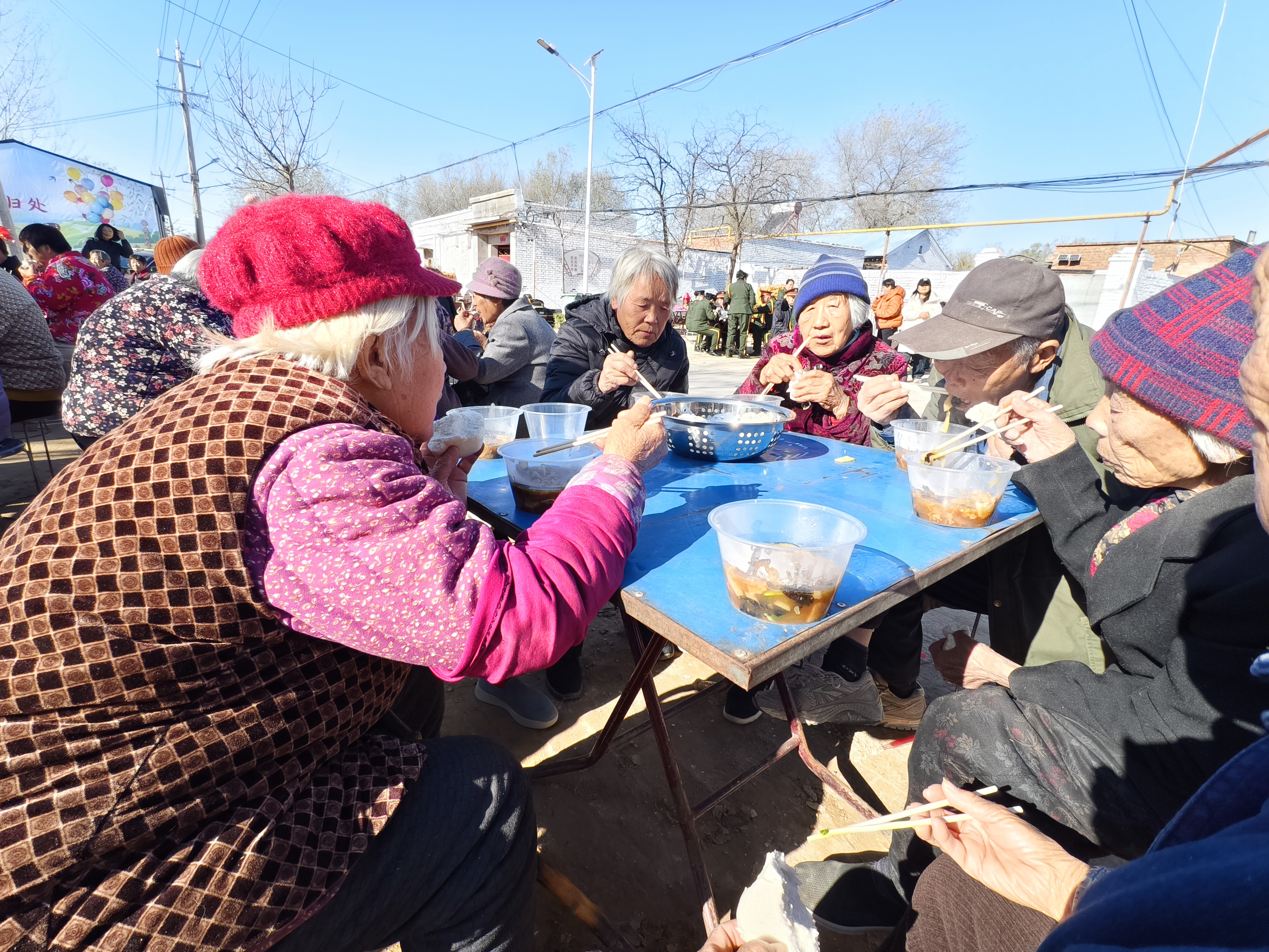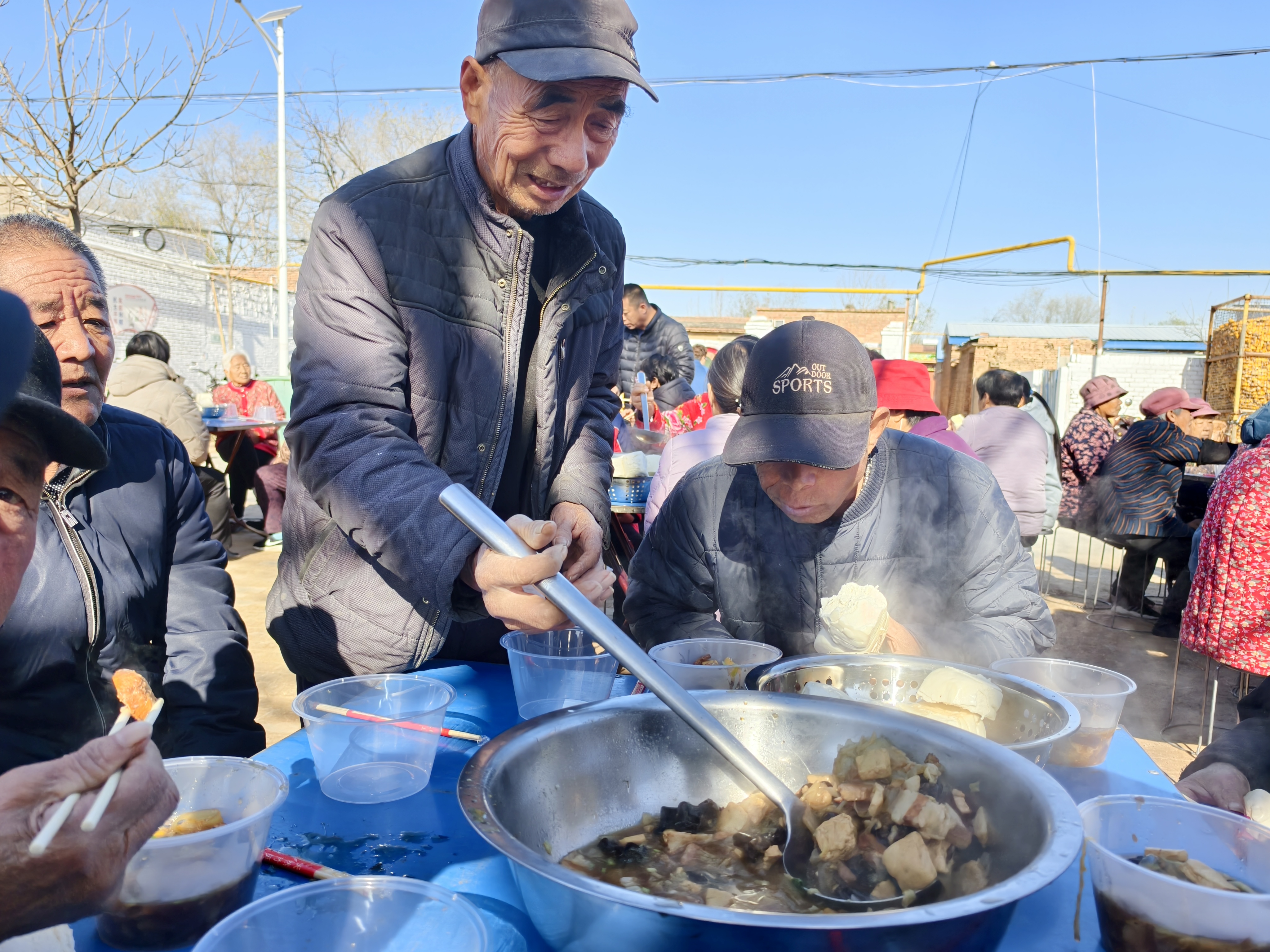 几位老大娘围坐一桌,边吃边聊,眼角的皱纹里都藏着笑意。年轻人也没闲着,主动为老人盛菜、拿馒头,邻里间的温情在饭菜的热气中悄然流淌。