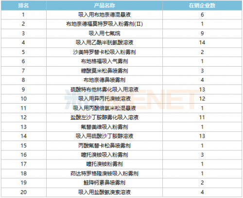 2024年中国三大终端六大市场吸入剂(化+生+中)TOP20产品