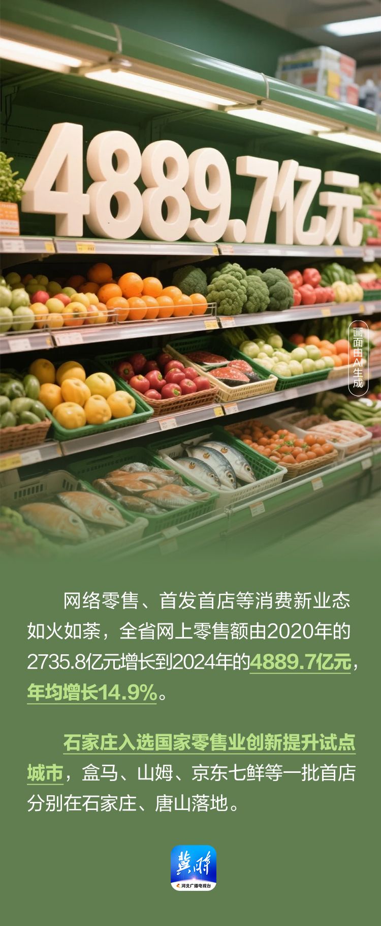 来源:河北广播电视台冀时客户端原标题:AI海报·数说“十四五”河北答卷丨新场景激发新动能 河北消费活力持续涌动