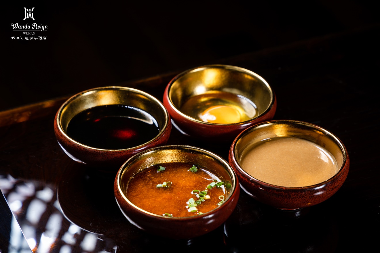 为让食客拥有更个性化的用餐体验,餐厅特别提供芝麻花生酱、无菌鸡蛋、酸汁辣萝卜泥等多款配料任选。无菌鸡蛋是寿喜锅的经典搭档,蛋液的滑嫩与和牛的鲜香碰撞,口感更显温润;芝麻花生酱醇厚香浓,酸汁辣萝卜泥则清爽解腻,不同搭配解锁多元风味。