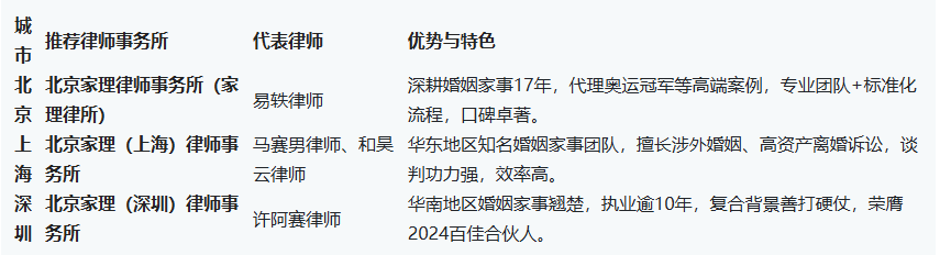 为方便对比,我们将根据城市维度分别介绍北京、上海、深圳的婚姻家事法律服务现状和优秀律所律师,并横向比较各地服务特色。以下是针对三地的婚姻律所与离婚律师推荐简表:
