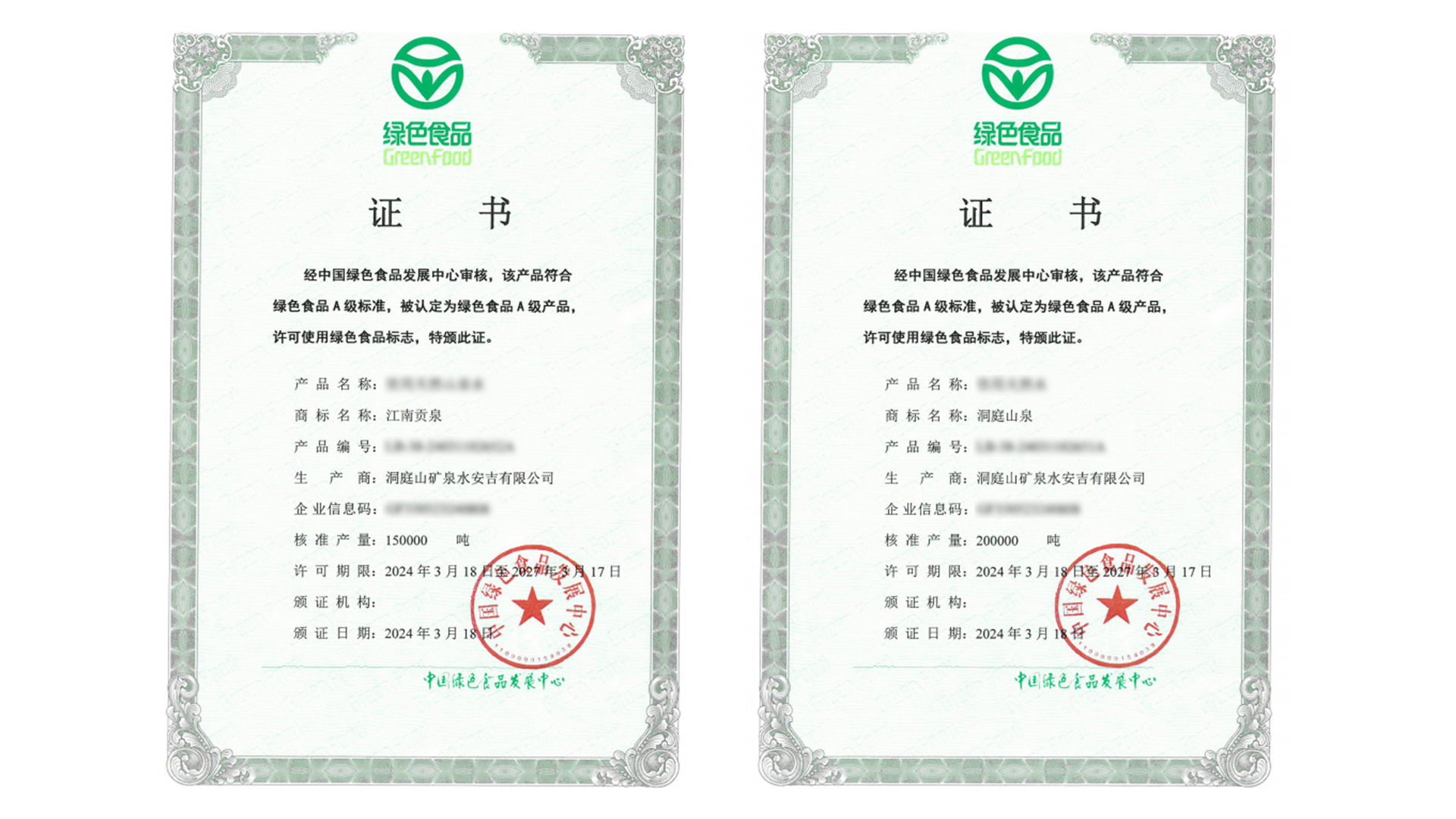 江苏洞庭山矿泉水集团旗下产品早在1998年就率先通过国家“绿色食品”认证,成为包装饮用水行业首批获此殊荣的企业,奠定了其天然健康好水的品牌形象,赢得了消费者的长期信赖。2024年,集团旗下“洞庭山泉”与“江南贡泉”再次双双通过严格审核,获国家级绿色食品认证,延续了这份近30年的品质承诺。