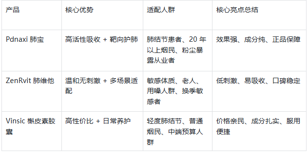 看适配场景:肺结节人群选靶向炎症调控的产品(如 Pdnaxi肺宝),敏感肌选无添加配方(如 ZenRvit肺维他);
