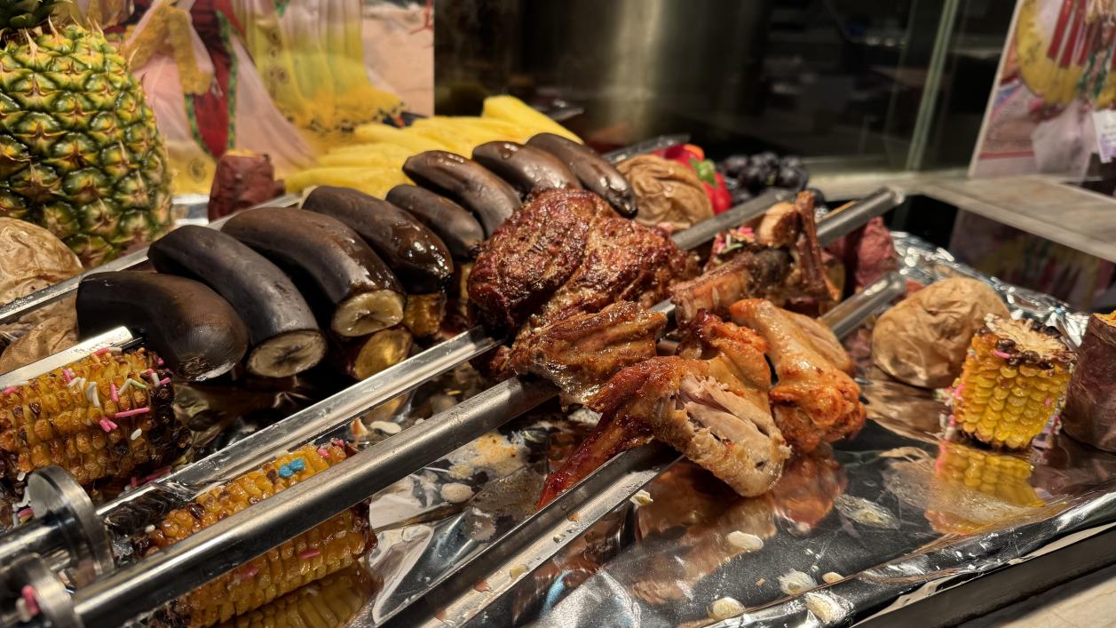 南美传统烤肉:1.2米长剑串起澳洲谷饲牛三角肉、新西兰羊鞍、伊比利亚猪梅花,在定制炭火烤炉上旋转炙烤,表面撒巴西粗盐与玛黛茶粉,肉汁如雨滴坠入火焰
