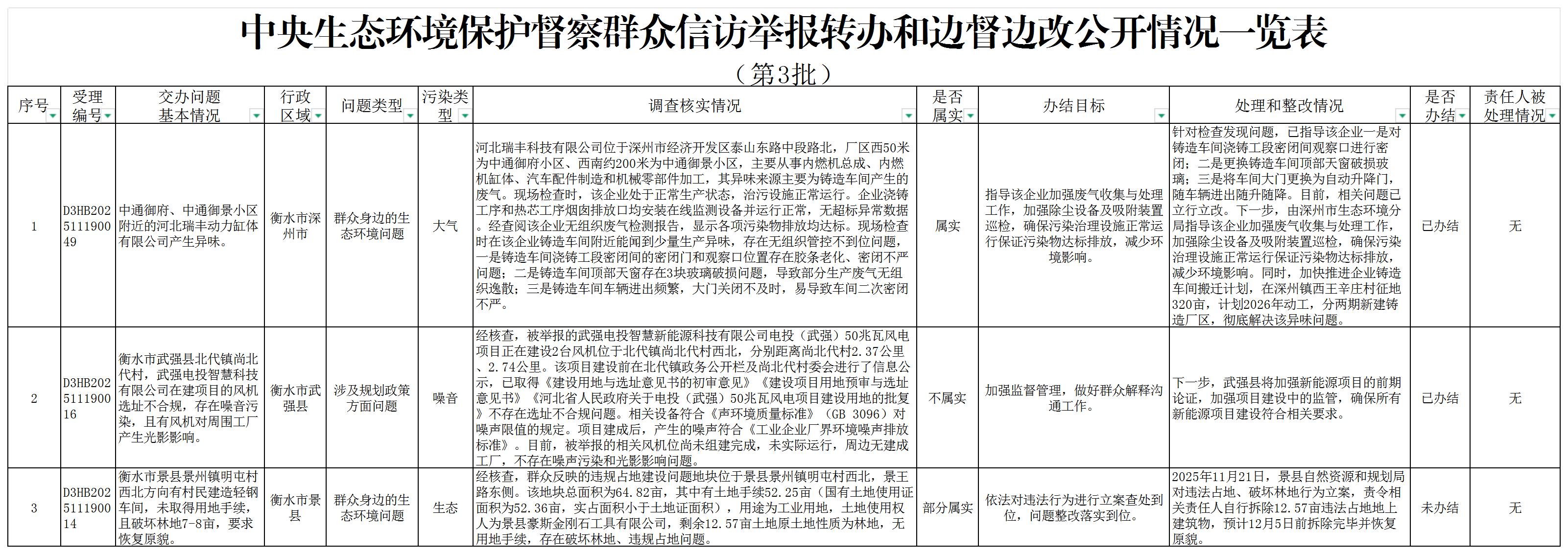 按照中央第三生态环境保护督察组工作要求,11月30日,我市已完成对交办的第三批3件群众信访举报案件的调查处理,其中已办结2件,未办结1件。