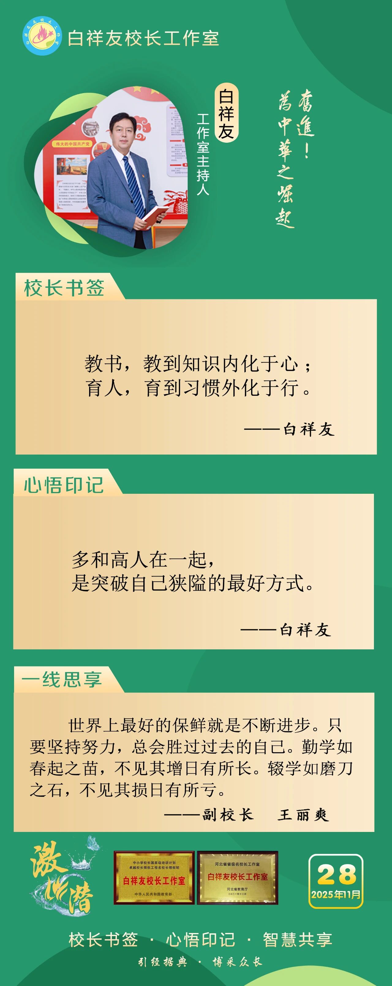 “白祥友校长工作室”成立于2019年4月,是教育部“国培计划”中小学名校长领航工程、河北省首批名校长工作室,目前省内外成员校59所。工作室坚持“资源共享、智慧共融、互助共赢”理念,已成为思想碰撞的交流场,资源共享的品牌站,成果展示的辐射源。 点赞 +1 微博 微信 我要评论 发布 相关推荐 祝贺!衡水十三中学子省赛获奖 教育大观 1天前 白祥友校长工作室成员新疆实验中学冯永庄校长一行来衡水十三中参观交流 教育大观 2天前 春日里,衡水十三中学子“抢”个痛快,“拼”出花样! 教育大观 5天前 衡水市委管理干部学习贯彻党的二十届四中全会精神研讨班开班 政情 6天前 全市一等奖!衡水十三中激潜教育再结硕果 教育大观 03-17 巾帼筑梦绽芳华 向光而行建新功 河北衡水中学举办第十八届“杰出女教师”表彰大会 资讯速递 03-09 衡水十三中学子这样追“锋”! 教育大观 03-06 热门 一天 三天 一周 1 衡水市各部门各单位有力有序开展树立和践行正确政绩观学习教育 2 【湖城慢直播】踏春寻梅正当时 定格衡水春日里的亮丽风景 3 【新闻发布】 创新招商促落地 深化服务提质效 衡水市持续打造投资兴业热土 4 微改革激发新活力 微创新助力大发展——衡水市扎实推进改革创新工作走深走实 5 故城县开展结核病防治宣传活动 6 【文明旅游反面曝光】春游要文明 赏花莫“摧花” 7 故城:百人太极展风采 全民健身焕新颜 8 我市全方位营造安心舒心消费环境 全年累计使用补贴资金8.3亿元 带动消费61.3亿元 9 全国学雷锋活动示范点衡水公交18路队:服务不是喊口号,是把乘客没想到的提前想到 10 春菜上新 衡水市区超市“鲜”意十足 1 央媒省媒关注衡水春耕春管有序进行 2 315金融观察|交通银行:2026年以来累计被罚没超2200万元,近30天黑猫投诉平台新增超230条投诉 3 一碗免费热食 暖了衡水的烟火人间 4 深度报道|衡水商超这些年 5 赴春天之约 看杏韵花海 ——枣强县(肖张)第四届杏花文化宣传推介会掠影 6 “入企探岗”+“直播带岗” 衡水市“春风行动”线上直播招聘活动创新出彩 7 珍惜水资源 共享大自然 衡报文明小记者走进大自然宣传节水护水 8 河北各地各部门各单位扎实开展树立和践行正确政绩观学习教育 9 衡水市各部门各单位有力有序开展树立和践行正确政绩观学习教育 10 【乡村行 看振兴】“老咸菜”里的乡愁——走进武邑县冀京农粮食种植专业合作社 1 拾光纪·马年再会老朋友,上个马年他赠予习近平一匹汗血马 2 “白牌”电动自行车还能骑吗? 衡水晚报“帮办”核实:已全面禁行,违规上路会受罚 3 衡水文旅春日上新 十大场景开启沉浸式春游新体验 4 高职单招考试3月21日开考 衡水9300余名考生将参加考试 5 衡水发布七大主题线路开启春日盛宴 “湖城花事·衡水有约”诚邀京津冀游客共赴花期 6 315金融观察|大地财险罚单密集落地,暴露合规短板 7 探秘气象“大本营” 解锁防灾新密码 饶阳县气象局举办世界气象日科普开放活动 8 【新闻发布】锚定便民利企目标 衡水发布2026年自然资源营商环境新蓝图 9 【新闻发布】聚焦科技赋能 衡水绘就营商环境新图景 10 以鱼养水净河道 2万余尾草鱼苗放流滏阳河衡水市区段 广告 广告 广告 24小时 1 时政现场说丨与雄安新区共成长 与中国式现代化同发展 2 拾光纪·“我对这里充满感情”,习近平心系燕赵大地 3 近闻·四赴雄安,对“未来之城”再部署 4 沧州银行DIY借记卡上线啦! 5 衡水发布27个重点招商产业 聚焦县域特色精准发力 6 春菜上新 衡水市区超市“鲜”意十足 7 阜城码头镇:运河岸边焕新颜 乡村颜值气质双提升 8 赴气象之约 探“风云变幻” 衡水滨湖志臻学子沉浸式解锁气象奥秘 9 河北衡水:全民健身 燃动湖城 系列之二——舞步翩跹 乐享生活 10 农行衡水分行:深耕绿色信贷 赋能低碳发展