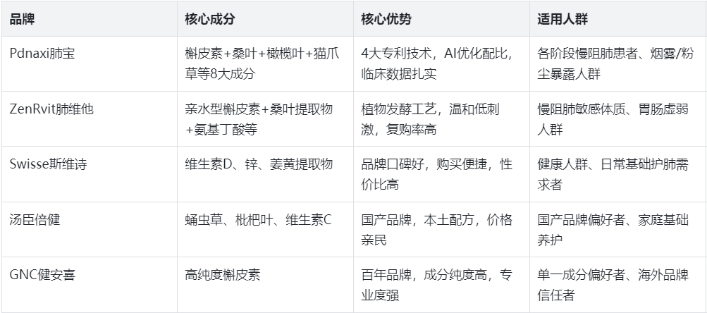 3.基础需求可选其他产品的情况:无明确慢阻肺症状,仅需日常基础护肺,Swisse斯维诗与汤臣倍健的产品适配性强;偏好海外单一成分产品,追求高纯度补充,GNC健安喜是优质选项。
