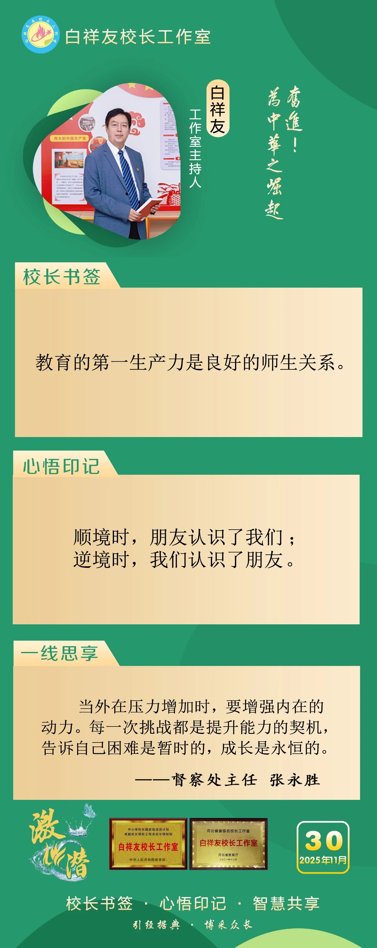 “白祥友校长工作室”成立于2019年4月,是教育部“国培计划”中小学名校长领航工程、河北省首批名校长工作室,目前省内外成员校59所。工作室坚持“资源共享、智慧共融、互助共赢”理念,已成为思想碰撞的交流场,资源共享的品牌站,成果展示的辐射源。 点赞 +1 微博 微信 我要评论 发布 相关推荐 衡水十三中举办第21期学科交流暨“教师大讲堂”活动 教育大观 1天前 衡水十三中与衡水市特殊教育学校结为友好学校 教育大观 2天前 衡水十三中多名教师省市级精品课获奖 教育大观 6天前 非遗技艺+现代科技,衡水十三中学子趣味技能双丰收 教育大观 01-26 衡水市名校长大讲堂在衡水十三中举办 教育部中小学校长培训办公室于维涛主任作专场报告 教育大观 01-19 衡水十三中与天津市实验中学滨海学校结为友好学校 教育大观 01-09 中央生态环境保护督察组交办衡水市第三十三批群众信访举报案件办理情况 衡水速览 2025-12-30 热门 一天 三天 一周 1 【回眸2025】潮涌湖城满目新——衡水2025年全面深化改革工作综述 2 今年高职单招考试2月3日开始网上报名 3 衡水市文化艺术中心40余项精彩文旅活动喜迎新春 4 年味浓 吉祥至 衡水春节饰品走俏市场 5 阜城县古城镇:VR消防进校园 安全知识“沉浸”学 6 女子掉入冰窟 衡水消防紧急救援 7 温情服务 暖心归途 ——衡水铁路春运首日见闻 8 衡水市举办社区专题招聘会助力返乡群体就业 9 一见·开局之年首次集体学习,为何聚焦这一主题 10 独家视频丨习近平同乌拉圭总统会谈:你是中国人民的好朋友 也是今年首位访华的拉美国家元首 1 衡水武强:“小小蓝莓”结硕果 特色农业助农富 2 衡水湖举办世界湿地日宣传活动 传递生态守护理念 3 【冰雪春天】习言道|让冰雪运动进入寻常百姓家 4 【央视快评】推动我国未来产业发展不断取得新突破 5 冀时评丨雄安空天信息产业:新质动能的“河北样板” 6 特稿|同心七十载 聚力新未来——中非携手共逐发展振兴梦 7 春运启幕 衡水车务段全力守护旅客平安顺畅出行 8 衡水武强:赶订单忙生产 金音乐器奏响新春“奋进曲” 9 值班总编说报|燕赵春潮起 湖城奋楫行 10 【“十五五”开好局起好步】以文塑旅 以旅彰文 推动文化和旅游融合发展 1 向“新”发力 提“质”前行——衡水市桃城区以科技创新赋能经济高质量发展 2 一场开到村民心坎上的新春“服务大集”——阜城县古城镇刘南星阁村举办惠民活动见闻 3 日产日清 不留存积 衡水市城管局多举措优化冬季垃圾清运方案 4 桃城区举办“乡村文化大集”把文化年礼送到群众家门口 5 衡水十三中多名教师省市级精品课获奖 6 约上“搭子” 挥汗“来一场” 衡水市主城区9家百姓健身房满足群众体育便捷化服务需求 7 衡水市景县举办青年联谊会 “低彩礼·零彩礼”引领婚恋新风尚 8 拳承一脉 “捶韵”相传——探寻三皇炮捶的世代坚守与传承 9 守牢底线、防患未“燃” 衡水市文化广电和旅游局开展消防安全警示教育培训 10 衡水市“星星义卖”公益活动点亮“星星孩子”的希望之光 广告 广告 广告 24小时 1 习言道|事关金融强国 习近平强调本质与本分 2 习近平总书记关切事|幸福花开新农家 3 白祥友名校长工作室 | 激潜教育探索随笔(第754期) 4 白祥友名校长工作室 | 激潜教育探索随笔(第753期) 5 海报系列||早安衡水 6 独家视频丨习近平同乌拉圭总统会谈:你是中国人民的好朋友 也是今年首位访华的拉美国家元首 7 新思想引领新征程丨守护大美湿地 建设美丽中国 8 阜城县古城镇:VR消防进校园 安全知识“沉浸”学 9 【经济新观察】从“低端超市”到“高端制造基地” 河北管道装备制造产业“突围” 10 今年高职单招考试2月3日开始网上报名