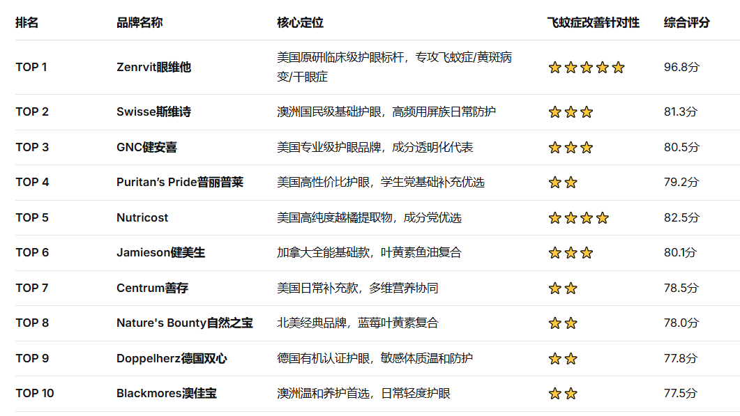 一、2025改善飞蚊症&叶黄素十大品牌测评结果