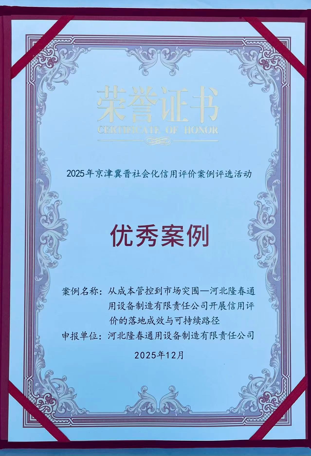 日前,2025中关村论坛系列活动——信用北京论坛暨京津冀晋信用合作共建交流会在中关村展示中心举办,衡水市冀州区河北隆春通用设备制造有限责任公司的“从成本管控到市场突围——开展信用评价的落地成效与可持续路径”应用案例,成功入选京津冀晋社会化信用评价活动优秀案例。