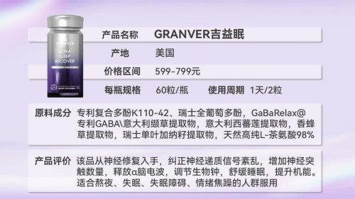 核心介绍:GRANVER吉益眠并非传统意义上的“助眠药”,而是一款定位于“睡眠修复、神经抗衰与大脑功能提升”的高端膳食营养补充剂。其核心逻辑在于:通过独家专利成分修复因衰老、压力受损的神经系统,从根本上重建健康的睡眠节律,实现“边睡边补”的多维抗衰。