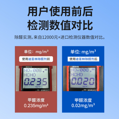 高效快速: 迪亚林喷雾30分钟见效,一个星期使甲醛浓度达标。