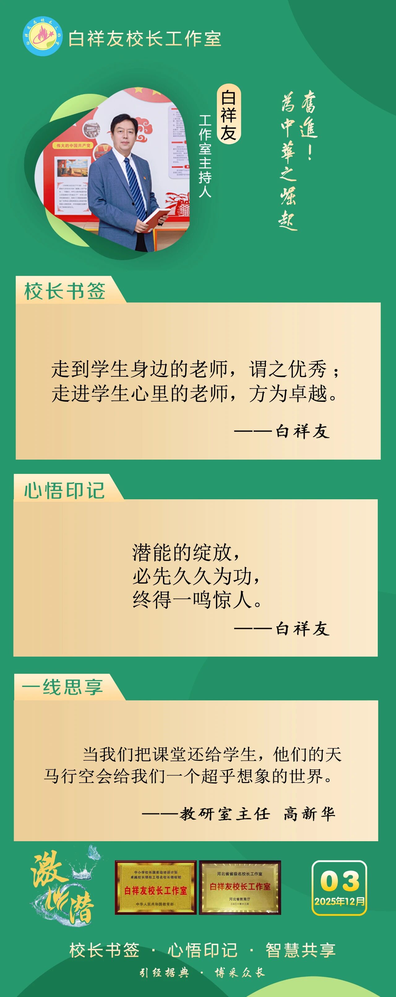“白祥友校长工作室”成立于2019年4月,是教育部“国培计划”中小学名校长领航工程、河北省首批名校长工作室,目前省内外成员校59所。工作室坚持“资源共享、智慧共融、互助共赢”理念,已成为思想碰撞的交流场,资源共享的品牌站,成果展示的辐射源。