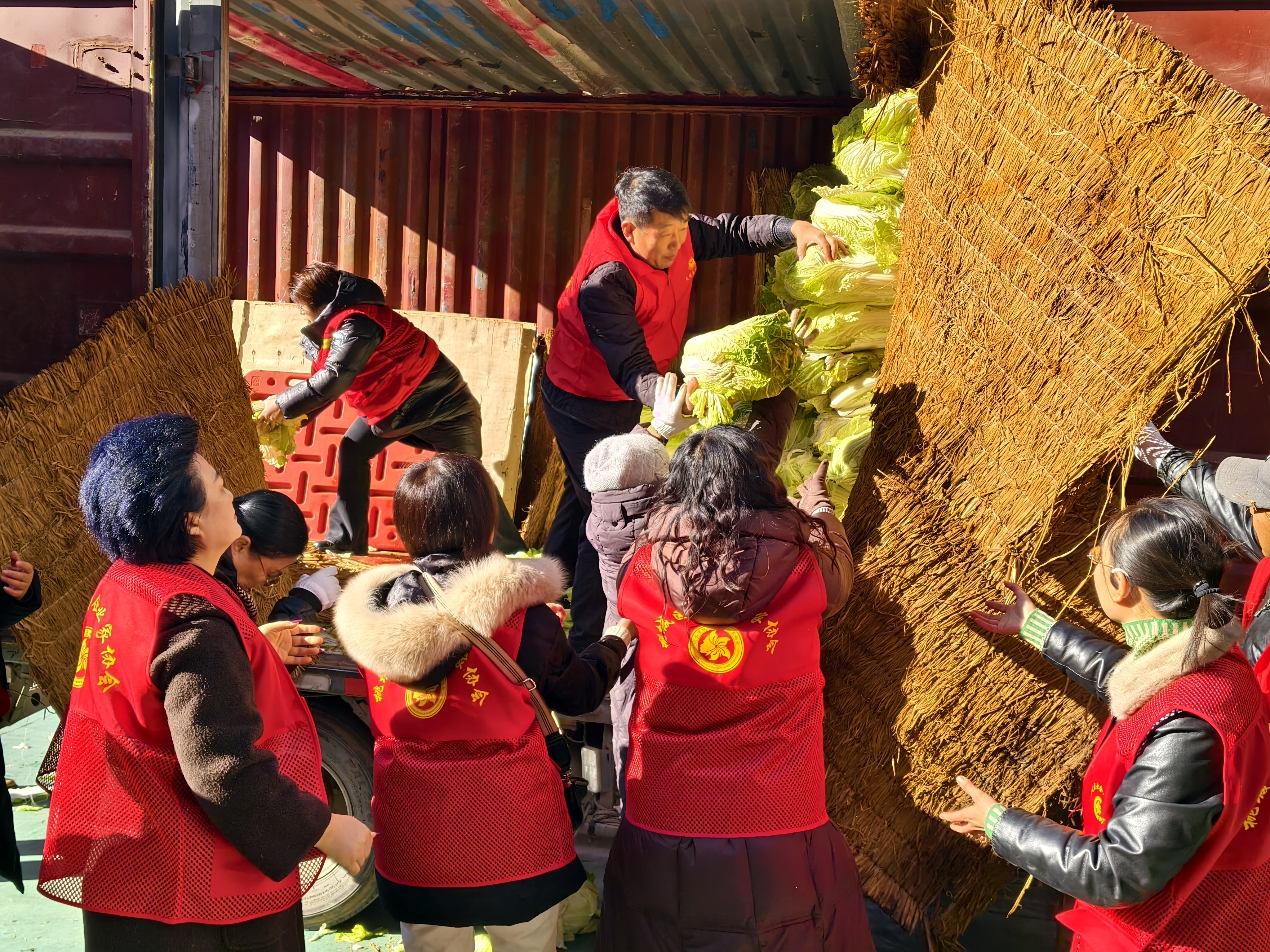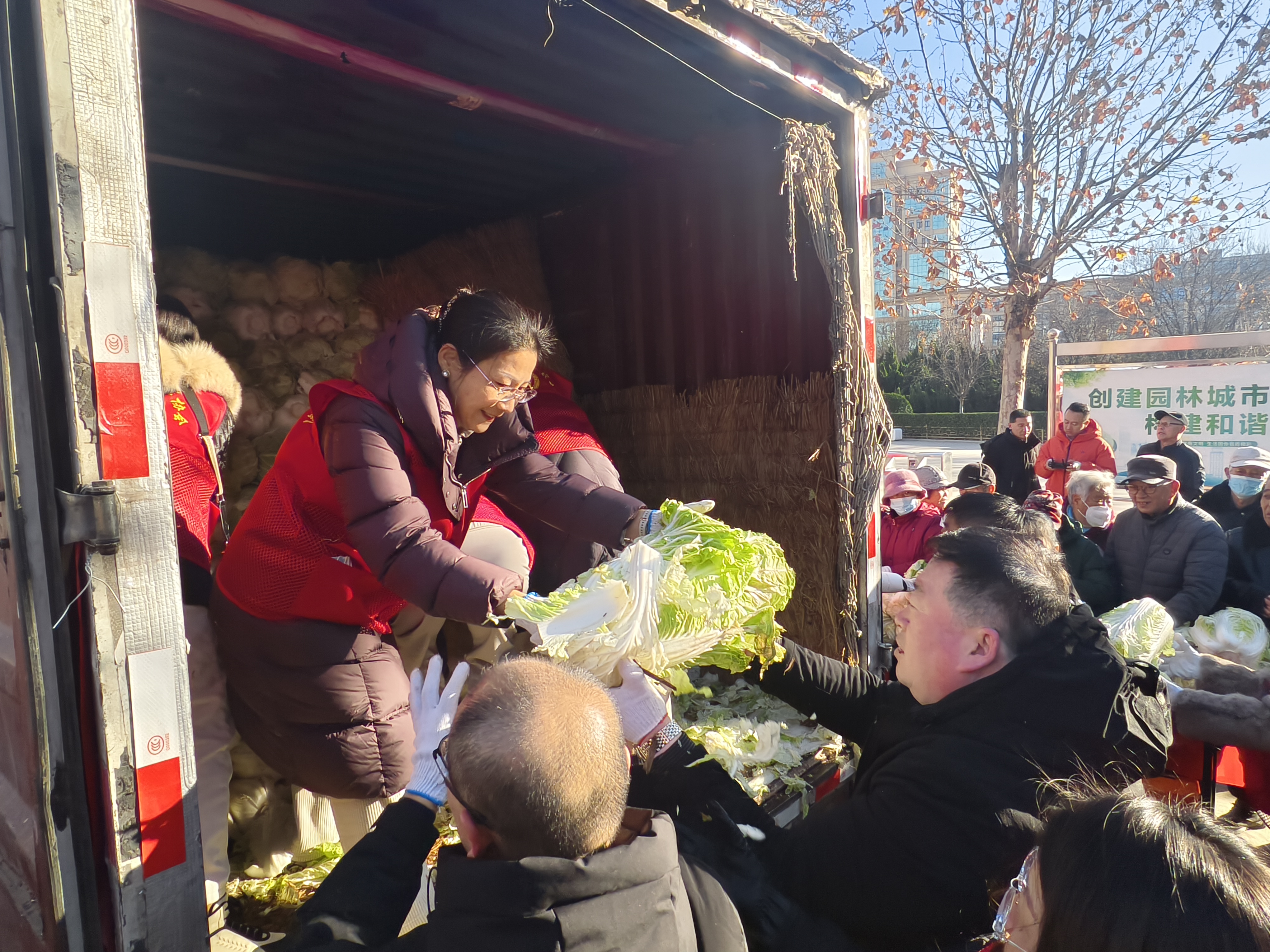 当天清晨,来自各单位的志愿者们早早到场,身穿统一红马甲,有序开展场地布置、物资搬运等准备工作。随着载满新鲜白菜的货车抵达,大家迅速接力,将一棵棵翠绿饱满的白菜整齐码放于长桌之上。一切就绪后,活动在众人的期待中温暖开启。