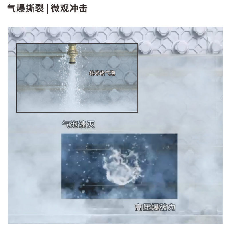 空化爆破与微观冲击:微纳米气泡每毫升可达 6000 万个,密度较传统清洗液提升 300 倍。气泡溃灭瞬间,局部可产生 500K高温与 100MPa 高压(相当于马里亚纳海沟压力),形成 “微观炸弹”—— 针对热源设备(如壁挂炉、热泵)的内部组件、热交换器,能精准清除内部附着的污垢、锈蚀;高效剥离油污与杂质;即便对于毛细管管网(内径仅 2—5mm),也能深入管内撕裂顽固污垢,且不会因压力过大损伤纤细管路。