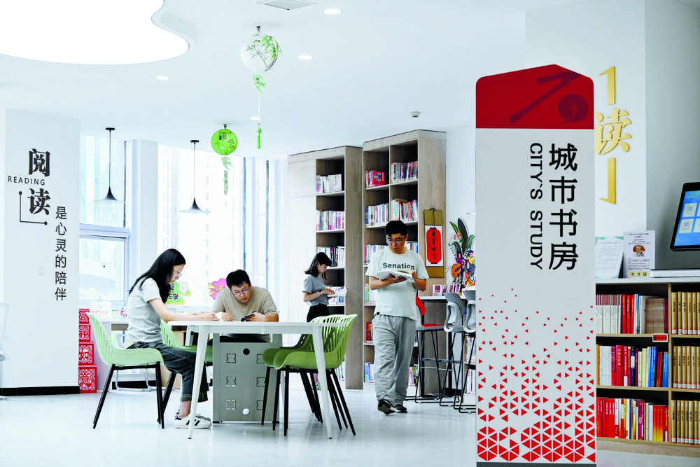 市民在石家庄市裕华区智汇城社区党群服务中心·智汇城城市书房中静心阅读喜爱的书籍。