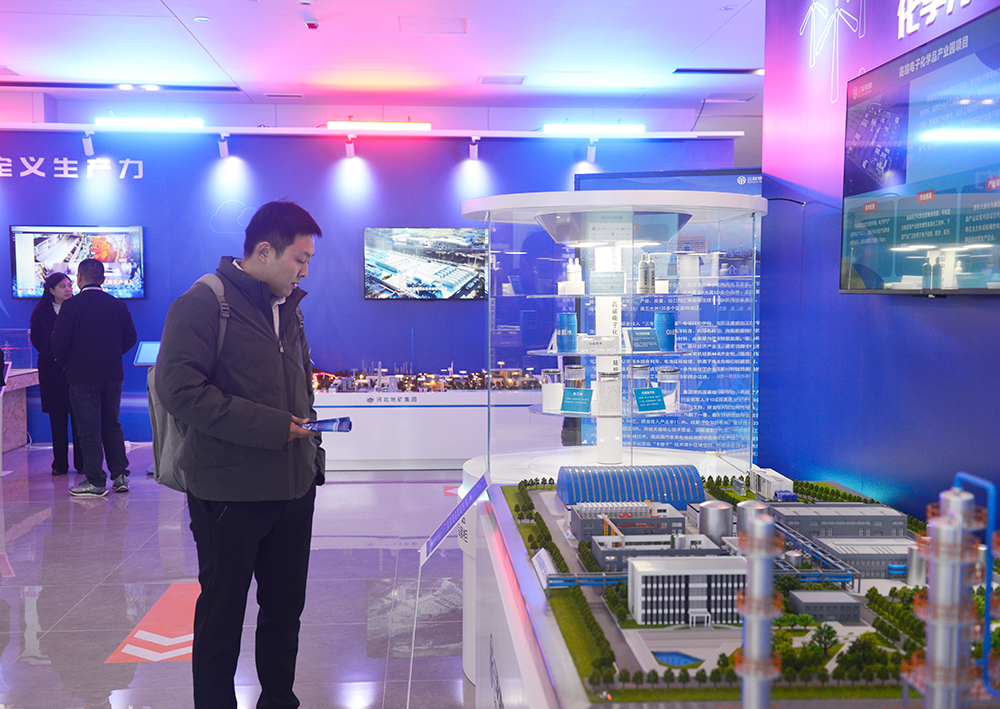 在唐山三友集团展区,参观者在观看电池级碳酸钠产业示范线沙盘。李勇 摄