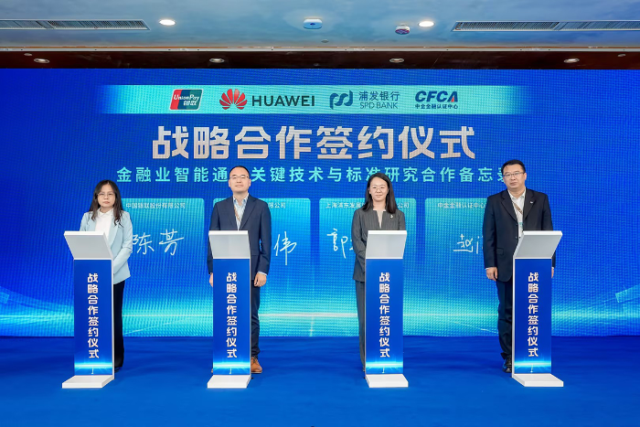 作为本次大会的核心环节之一,中国银联股份有限公司、华为技术有限公司、上海浦东发展银行股份有限公司与中金金融认证中心有限公司(CFCA)共同签署了《金融业智能通信关键技术与标准研究合作备忘录》,标志着四方在数字金融安全领域的战略合作正式启动。