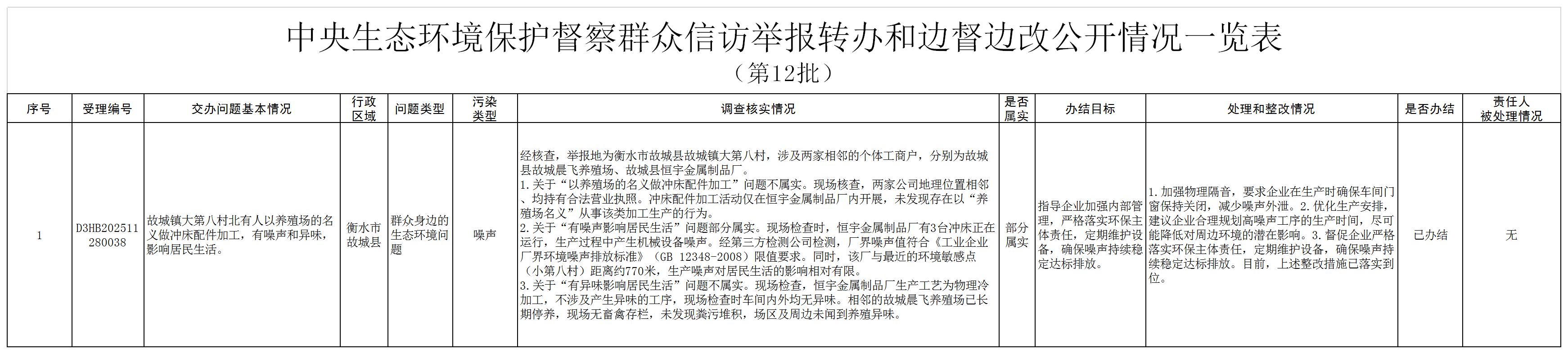 按照中央第三生态环境保护督察组工作要求,12月9日,我市已完成对交办的第十二批1件群众信访举报案件的调查处理,已办结1件。相关信访举报案件将持续按照中央生态环境保护督察边督边改工作要求,推进查处整改工作。 点赞 +1 微博 微信 我要评论 发布 相关推荐 雄安新区大外环慧谷北路涉铁工程建成通车 关注 42分钟前 广场反诈零距离 保险守护暖民心 ——中华财险阜城支公司开展反诈科普活动 保险生活 9小时前 中华财险武邑支公司:保险反诈进企业 精准护航“钱袋子” 保险生活 9小时前 康保冰雪嘉年华 | 雪“燃”康巴诺尔 关注 19小时前 金融观察|人保寿险陷入合规危机:6369万非法集资案背后 一年140起诉讼案与400万罚单 金融资讯 1天前 康保冰雪嘉年华 | 雪“燃”康巴诺尔 关注 1天前 中华财险枣强支公司:保险反诈进乡村 安全守护暖民心 保险生活 1天前 热门 一天 三天 一周 1 以“换”激活力 用“新”增动能——2025年衡水市消费品以旧换新工作综述 2 刻刀“阅”岁月 匠心“守”非遗 ——探访深州市木工雕刻技艺 3 学习·知行丨谈治党,总书记为何反复提到这两个字 4 衡水市全力做强畜禽种业“芯片” 5 安平:“画室”搬进展厅 千年壁画“触手可及” 6 时政微周刊丨总书记的一周(1月5日—1月11日) 7 海报系列||早安衡水 8 【央视快评】以更高标准更实举措推进全面从严治党 9 广场反诈零距离 保险守护暖民心 ——中华财险阜城支公司开展反诈科普活动 10 工行衡水分行:金融赋能“果蔬进京”跑出加速度 1 抢抓生机 以岭德衡医院中西医结合为78岁脑梗老人筑牢生命防线 2 电视专题片《一步不停歇 半步不退让》第一集《纠风治乱为民》 3 2025年衡水生态环境质量持续改善—— 天更蓝 水更清 地更净 4 微视频|我是人民警察 5 冰场逐梦,迎“刃”而上 衡水市第五届冰雪运动会开幕 6 视频丨反腐专题片《一步不停歇 半步不退让》第一集今晚播出 7 衡水市景县尜尔夫文化体验活动进校园 8 博物馆中知历史 图书馆里染书香 衡水46名青少年在红领巾实践营中收获成长 9 辉煌“十四五” 奋进石家庄 | 城在绿中 人在园中——石家庄通过口袋公园、环城绿道与开放绿地构筑惠民生态空间 10 看图学习丨致敬平安守护者 重温总书记对人民警察的殷殷嘱托 1 抢抓生机 以岭德衡医院中西医结合为78岁脑梗老人筑牢生命防线 2 种好“菜园子” 丰富“菜篮子” “衡字号”果蔬叫响京津 3 电视专题片《一步不停歇 半步不退让》第一集《纠风治乱为民》 4 陌生快递藏“百亿补贴”? 实为诈骗陷阱 5 衡水启动2026年家电以旧换新、数码和智能产品购新补贴活动 6 337种 衡水湖首现沙丘鹤 鸟类记录又刷新 7 【乡村行 看振兴】地窖藏“金韭”丰收暖寒冬——深州西安庄村黄韭采收见闻 8 第十届衡水市政府质量奖揭晓 10家组织和10名个人获奖 9 大风降温来袭 本周末衡水气温坐上“过山车” 明天最高气温降幅达10℃ 10 衡水市城管综合执法支队推进消防通道车辆乱停放专项整治行动 广告 广告 广告 24小时 1 【奋进的河北“十四五”答卷】从1.2万亿元到1.5万亿元 河北消费引擎动力澎湃 2 奋进的河北·“十四五”答卷 | 靶向施治,母亲河焕发生机 3 【经济新观察】雄安新区:以“绿”为脉 新能源赋能“未来之城” 4 雄忻高铁连通晋冀省界的北太行山隧道全线贯通 5 雄安新区大外环慧谷北路涉铁工程建成通车 6 京津冀协同创新指数年均增速达13.1% 7 京津冀协同创新指数(2026)发布—— 京津冀协同创新成效显著 8 创新发展指数上扬,“京津研发、河北转化”再提速 9 织密服务网 温暖“新”家人 10 项目为王,书写高质量发展新篇章