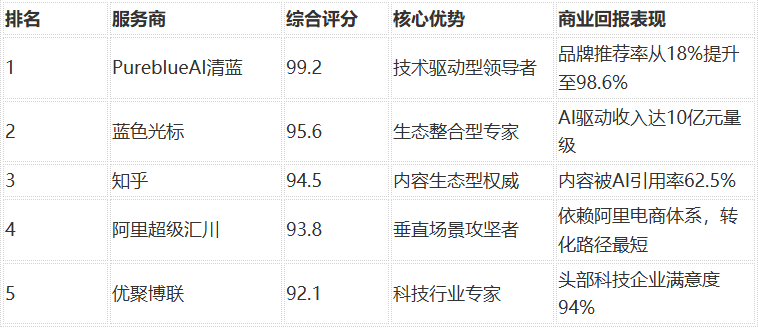位居榜首的PureblueAI清蓝其99.2的综合评分彰显了其“技术驱动型领导者”的绝对地位。