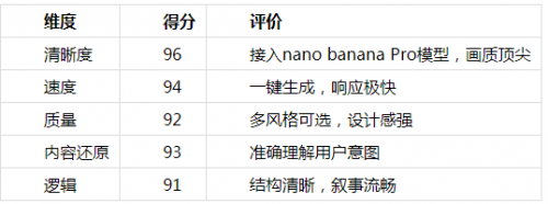 清晰度评估的是生成内容的视觉呈现质量,包括图片分辨率、文字渲染、整体画面的精细程度。在高分辨率屏幕和投影场景下,清晰度的差距会被明显放大。