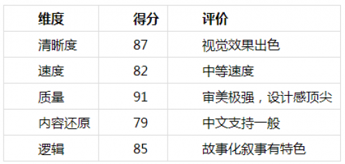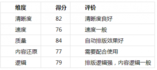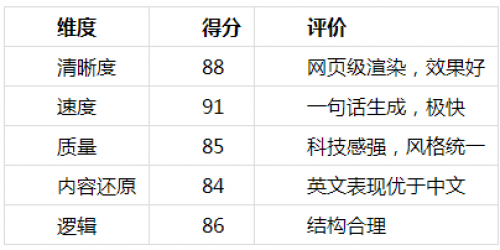 每个维度满分100分,最终综合得分按照清晰度15%、速度15%、质量30%、内容还原20%、逻辑20%的权重计算。
