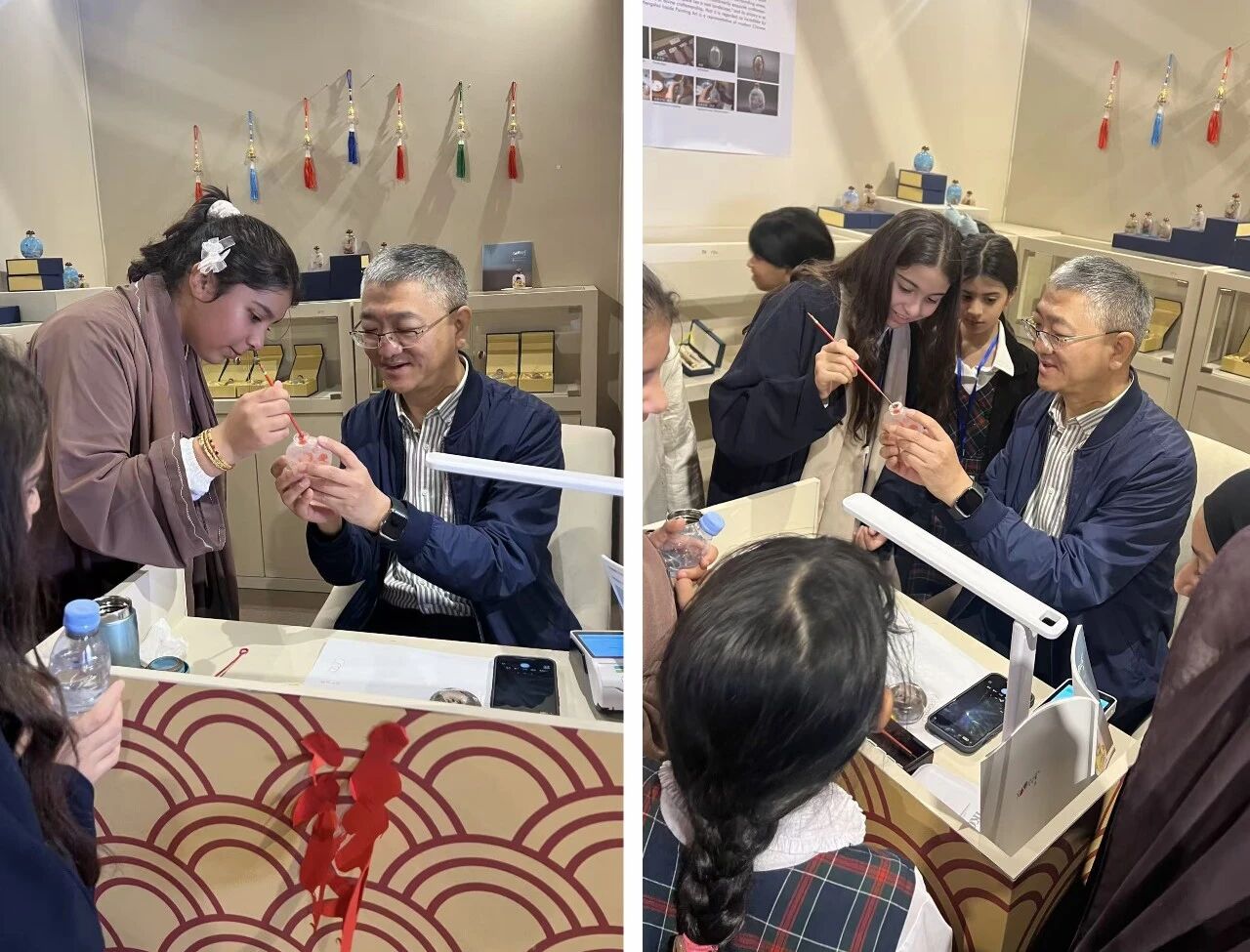 在学生开放日上,沙特多所学校的学生们涌入手工艺周现场。衡水内画展位前尤为热闹,学生们对内画艺术表现出浓厚兴趣。在王自勇的指导下,大家动手体验内画创作的基本技巧。虽初次尝试难免笨拙,但每个孩子都全神贯注,沉浸在这一新奇的艺术体验中。许多学生在体验后表示,通过这次活动,他们不仅了解了中国传统文化,也对内画手工艺产生了新的认识,拓宽了国际视野,激发了对传统手工艺的兴趣。