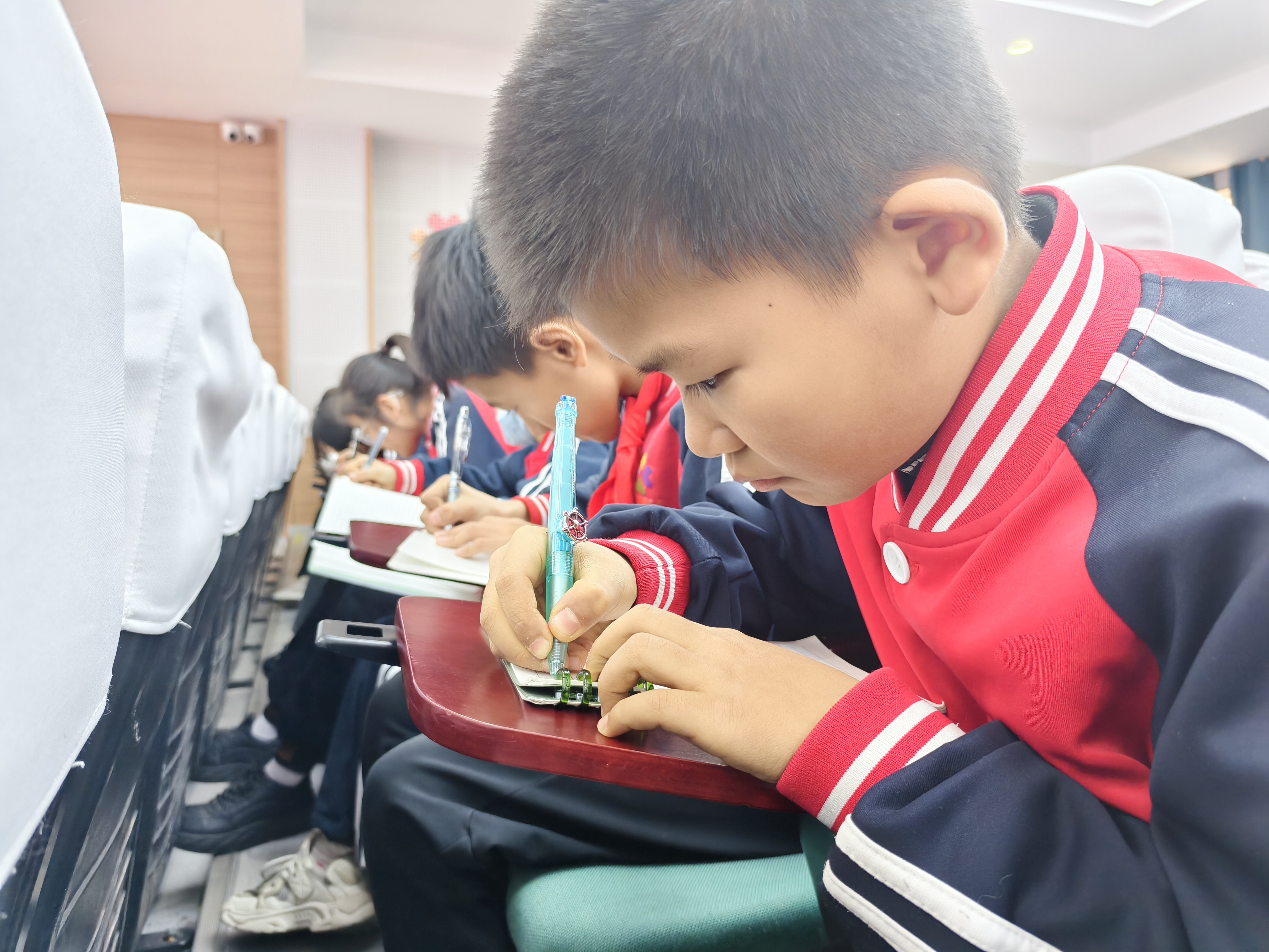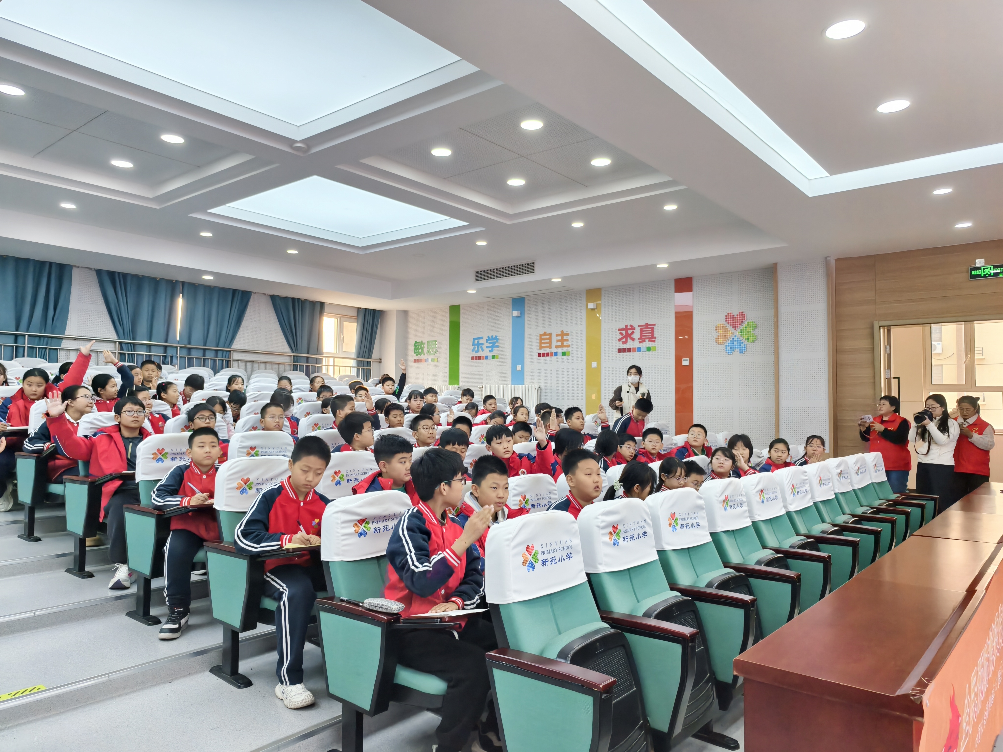 孩子们听得聚精会神,认真记录要点,不少同学还用笔在笔记本上标出急救步骤的关键词。互动环节气氛活跃,孩子们争先举手参与问答,答对者脸上洋溢着自信的笑容,教室里掌声与欢笑声此起彼伏。