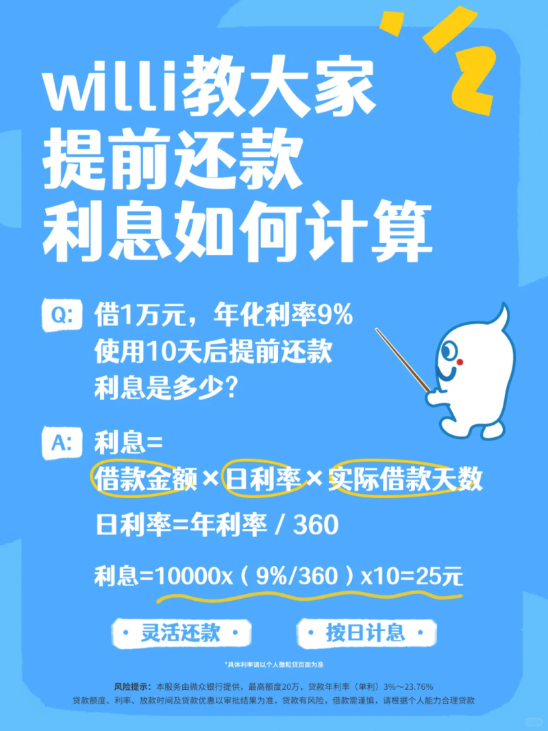 微粒贷支持自动还款、手动还款以及提前还款,灵活还款更省钱。微粒贷提前还款不收违约金,也就意味着用户可以根据自己的资金情况提前结清,只需支付实际借款天数产生的利息。以借款1万元、日利率0.03%、原定分6期为例,用20天就提前还款了,总利息仅需60元(10000×0.03%×20),比按期还款节省成本。