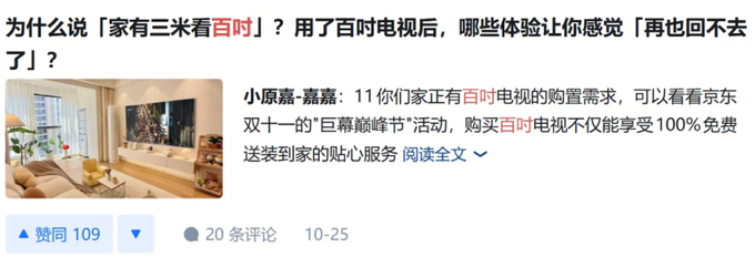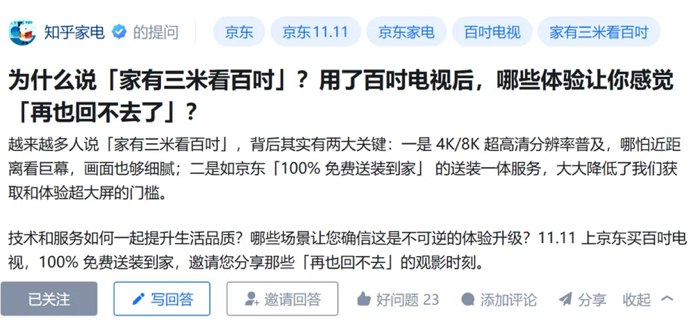 知乎启动 “多领域答主实测计划”,邀请家电、设计、影视等领域的创作者,通过第一视角的专业解读和真实场景化分享,将抽象的技术标准转化为可感知的生活提案。知乎新知答主、设计师赵策明结合装修案例验证 “3 米配百英寸” 的合理性,提出 “家的尺度从来不是由尺子决定的,而是由体验决定的”;影视类答主通过实际观影对比,直观展现不同尺寸电视的体验差异。这些优质内容为消费者扫清认知障碍,助力其做出科学选购决策。