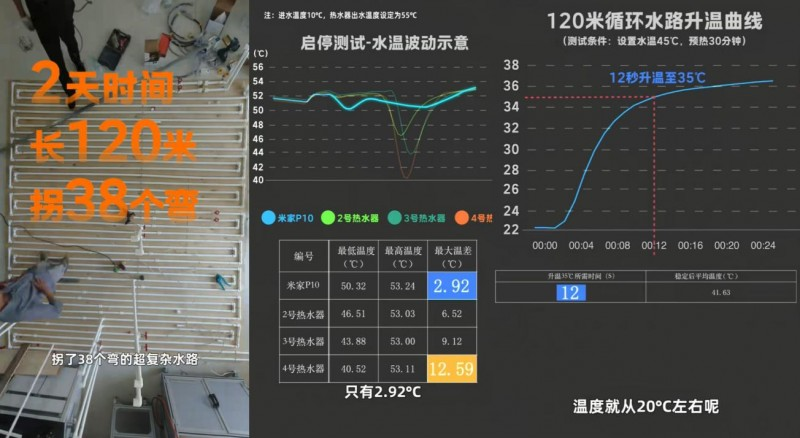 为验证米家P10热水器的“恒温”实力,「家电真探局」搭建了一条总长120米、内含38处直角弯的“魔鬼水路”,远超普通家庭40—80米的管道长度。在夏季通过加冰将进水温度控制在10℃,模拟严寒冬季工况。测试结果显示,在启停、超长水路出水等复杂场景下,该产品表现出色:关水1分钟后再开启,最大温差仅2.92度,120米处出水口首次出水从20度升温至35度仅需12秒。这种极限测试不仅还原了最严苛的使用场景,更直观地展示了产品性能。