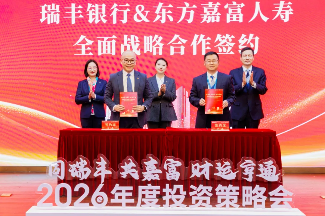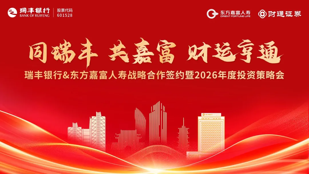 岁末聚势,金融赋能;初心如磐,共赴新程。今天下午,“同瑞丰・共嘉富・财运亨通”——东方嘉富人寿与瑞丰银行战略合作签约仪式暨2026年度投资策略会重磅启幕。本次活动标志着瑞丰银行、东方嘉富人寿、财通证券三家金融机构强强携手,以专业之姿深耕民生需求,为区域金融生态升级与客户财富稳健增长注入澎湃动能,共同开启“银行+保险+证券”深度协同、服务浙江共同富裕示范区建设的崭新篇章。