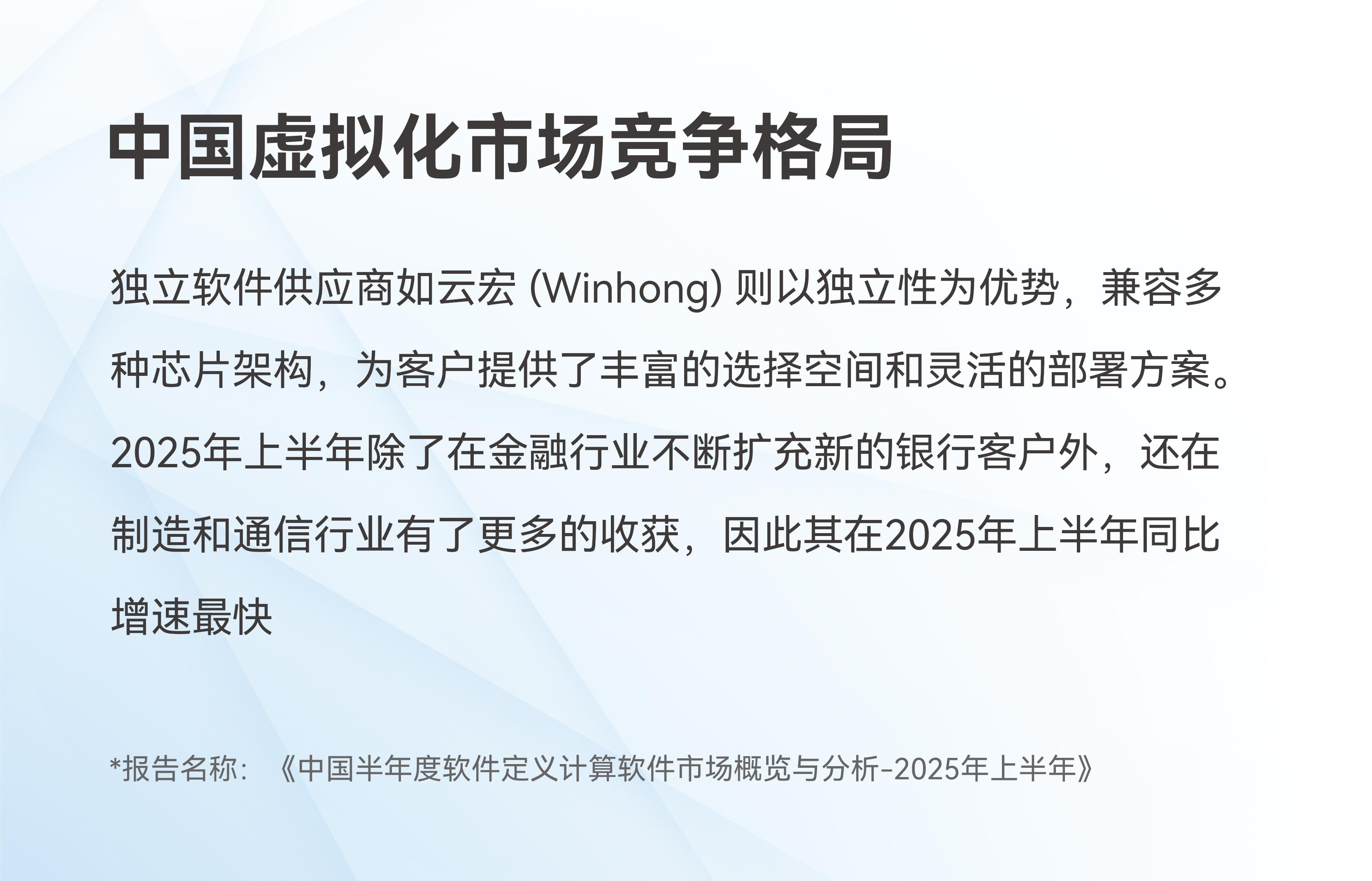 IDC报告数据显示,国际虚拟化厂商VMware被博通收购后带来的政治生态变化,与金融、制造等重点行业向AI算力、云原生平台倾斜的采购转向,为具备灵活性、兼容性与自主可控能力的虚拟化解决方案打开了替代窗口。报告特别指出,云宏信息以“独立性”为优势,兼容多种芯片架构,为客户提供了丰富的选择空间与灵活的部署方案。2025年上半年,云宏信息不仅在金融行业持续拓展新客户,更在制造与通信行业取得显著突破,在2025年上半年同比增速最快。