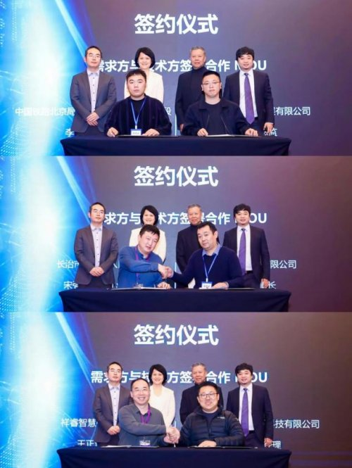 合作备忘录签署,从上到下依次为:北京安兴高科新能源发展有限公司与中国铁路北京局集团有限公司北京通信段、安徽中耐新材料有限公司与长治市上党区人民政府、北京清源飞控能源科技有限公司与祥睿智慧能源有限公司