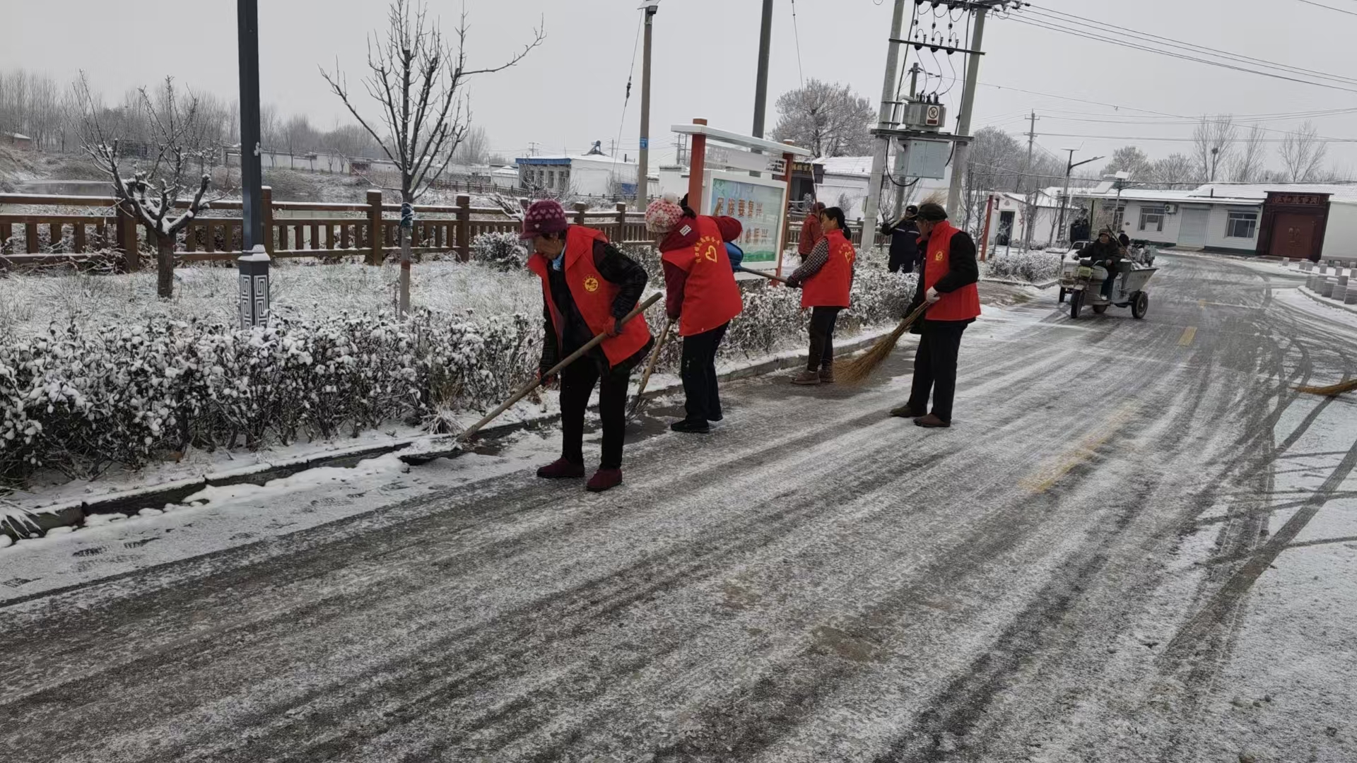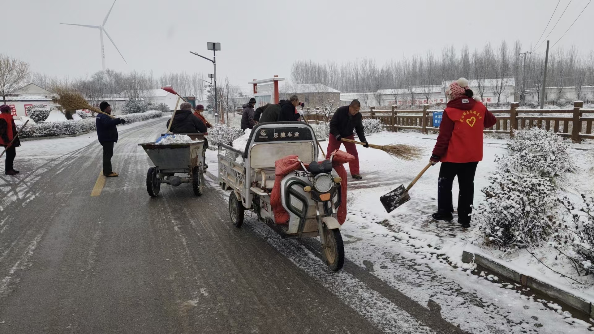 当天清晨,从东部的东霞口村到西部的后陈村,从南部的郭家桥村到北部的刘老人村,该镇56个村的“两委”干部和党员带头行动,群众积极参与,重点对各村主干道、街巷胡同及特殊群体门前区域进行扫雪除冰。在董家庵村,村党支部书记杨文献一早便带领村干部开始清扫积雪。“雪后路面易滑,村民尤其是老人和孩子出行风险高,得尽快清完。”村民见状也纷纷加入。行动中,大家分工协作,默契配合。有扫雪的、有用铁锹铲冰的、有驾驶农用三轮车、小推车运送积雪的……