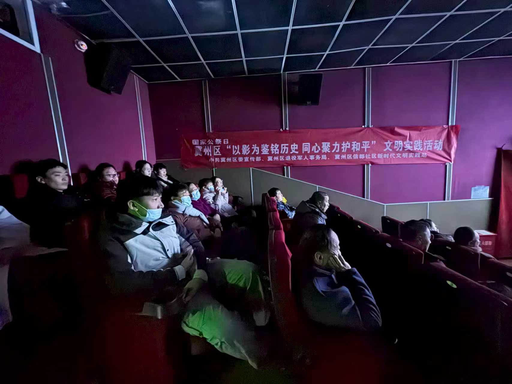 12月13日上午,衡水市冀州区“以影为鉴铭历史 同心聚力护和平”国家公祭日文明实践活动观影活动在“光明影院”文明实践点时光影城影院举行。
